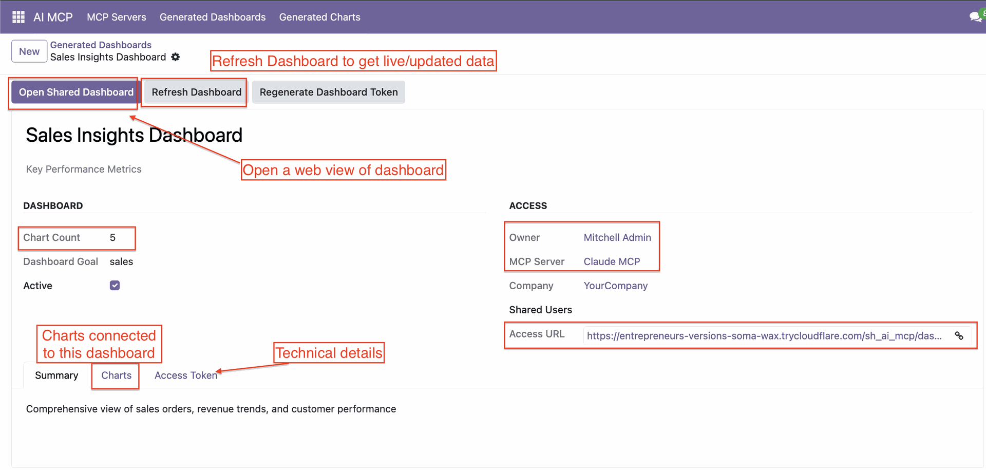 Create dynamic dashboards using secure token-based data access. Visualize key metrics and insights in a structured view.