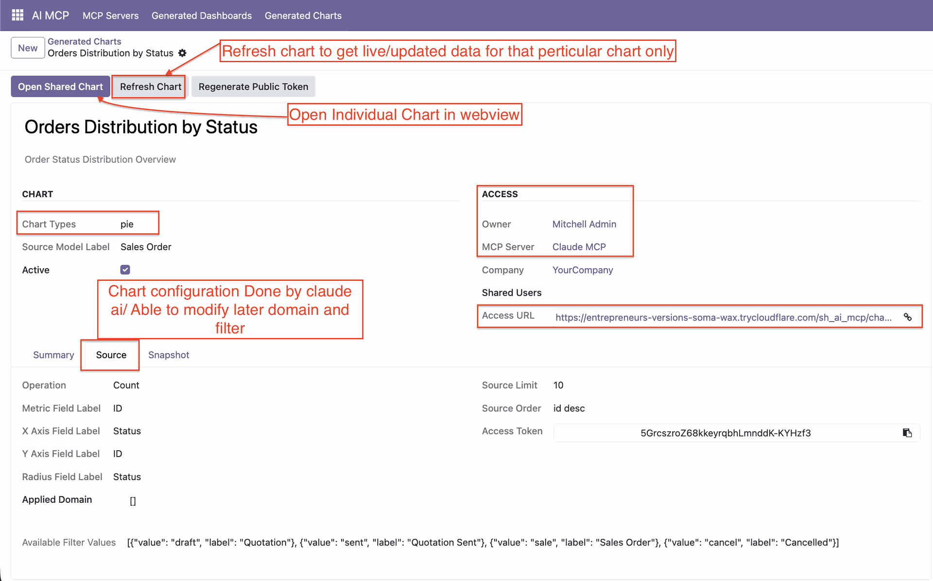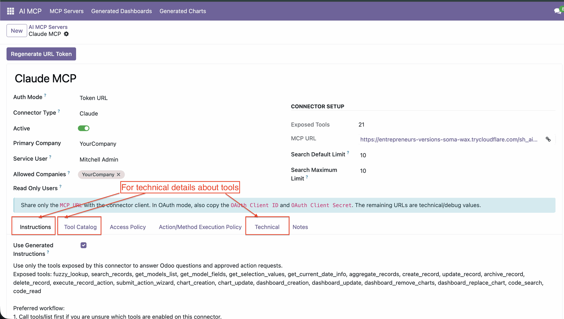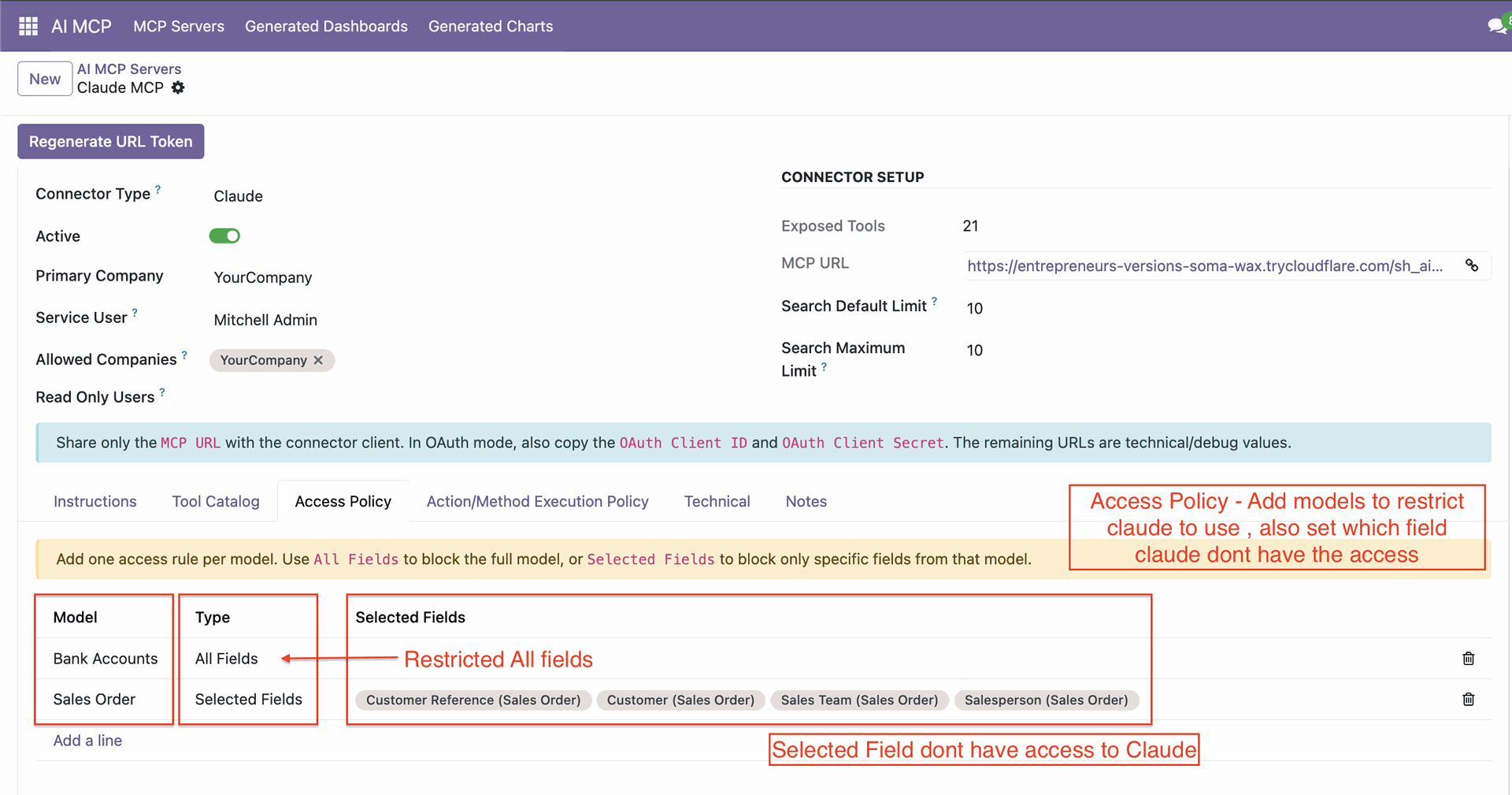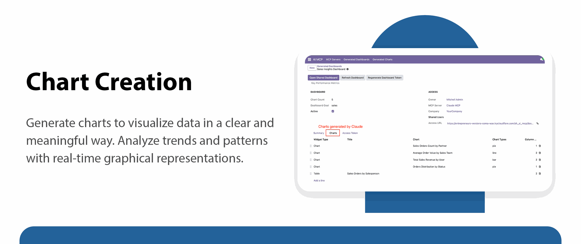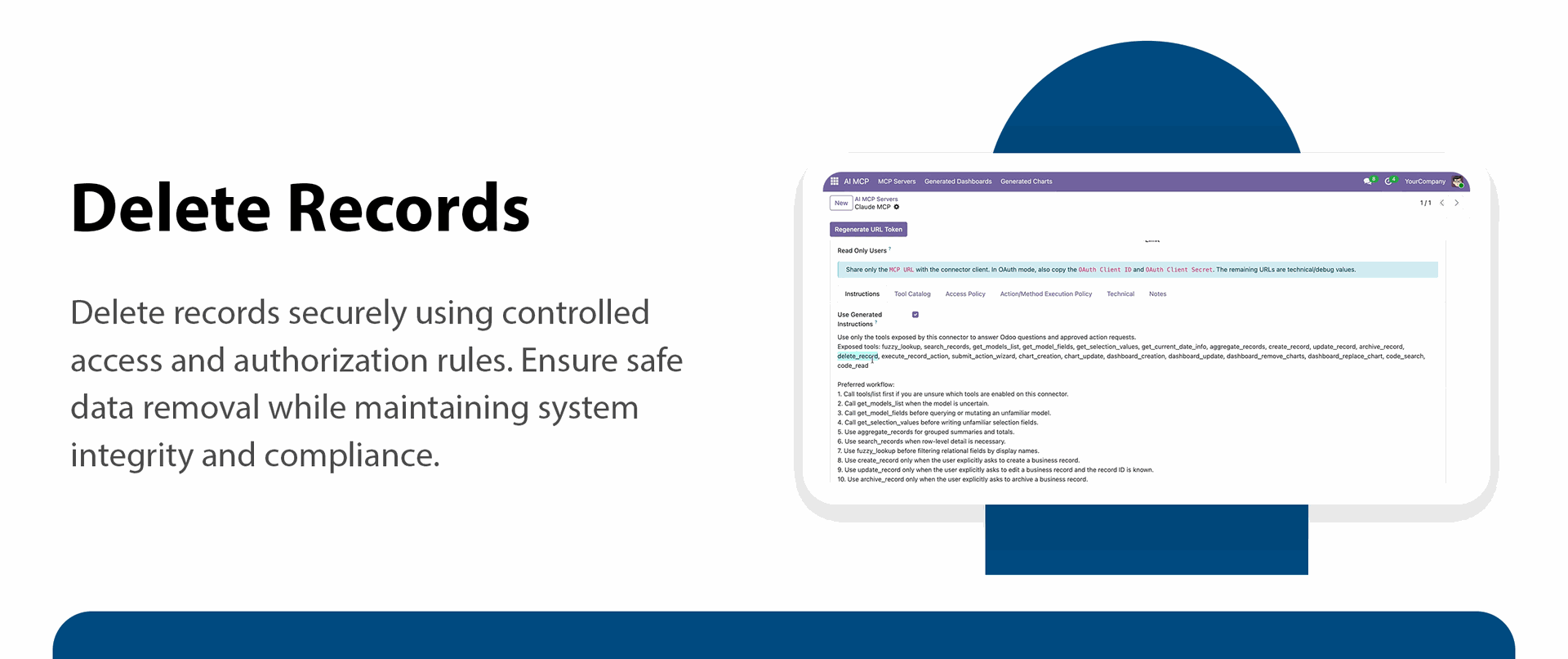 Create dashboards and charts using access tokens, perform full CRUD operations including record creation, updates, and deletion, and control execution using action policies. With flexible connection types and secure access management, MCP Studio enables structured, controlled, and scalable data interaction within Odoo.