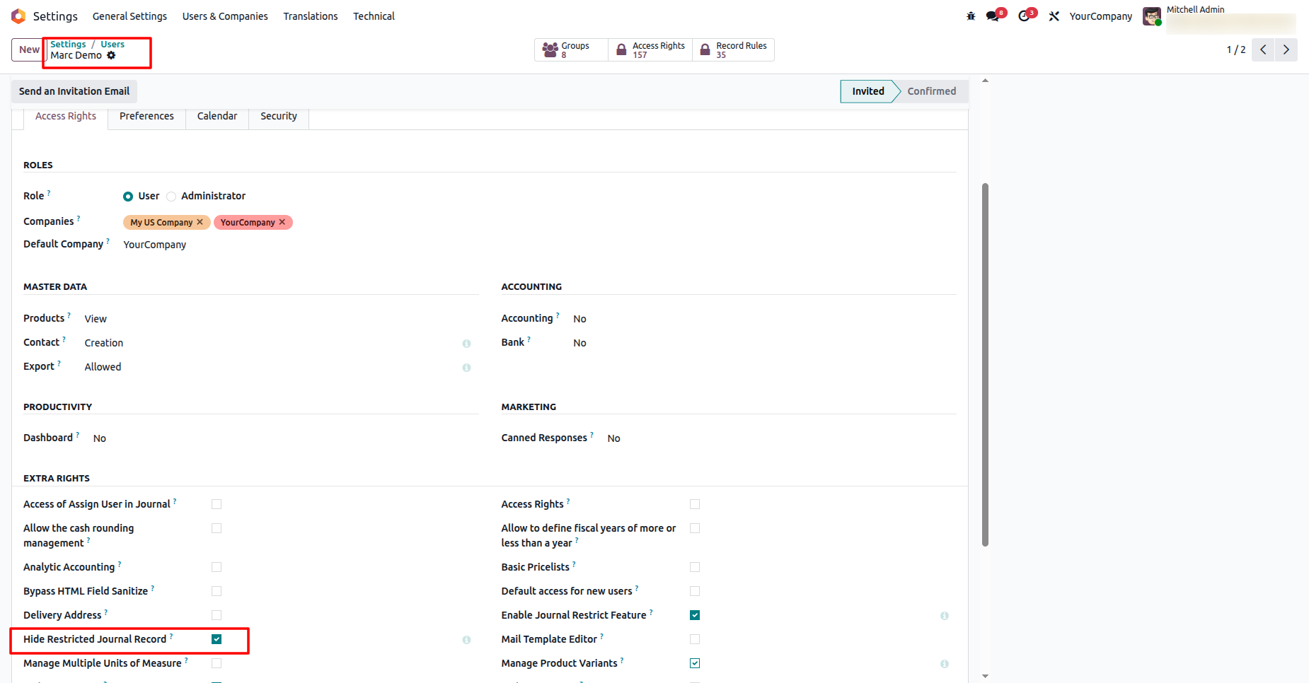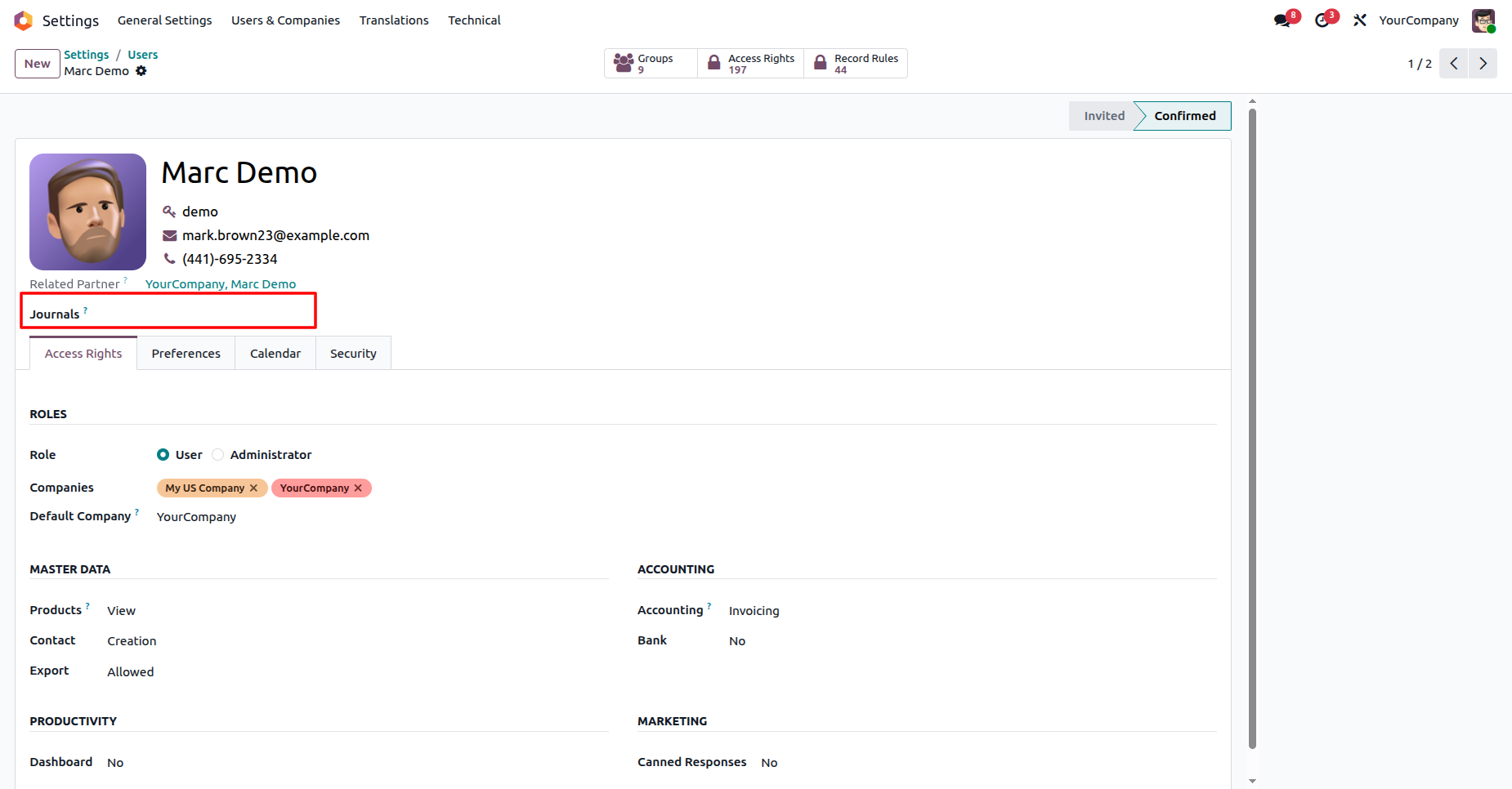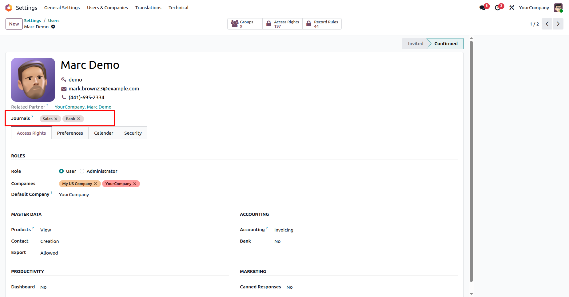 Limit which users can view or use specific accounting journals such as invoice, bill, cash, bank, sales, and purchase.