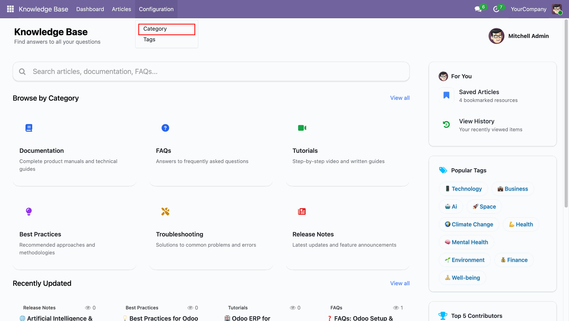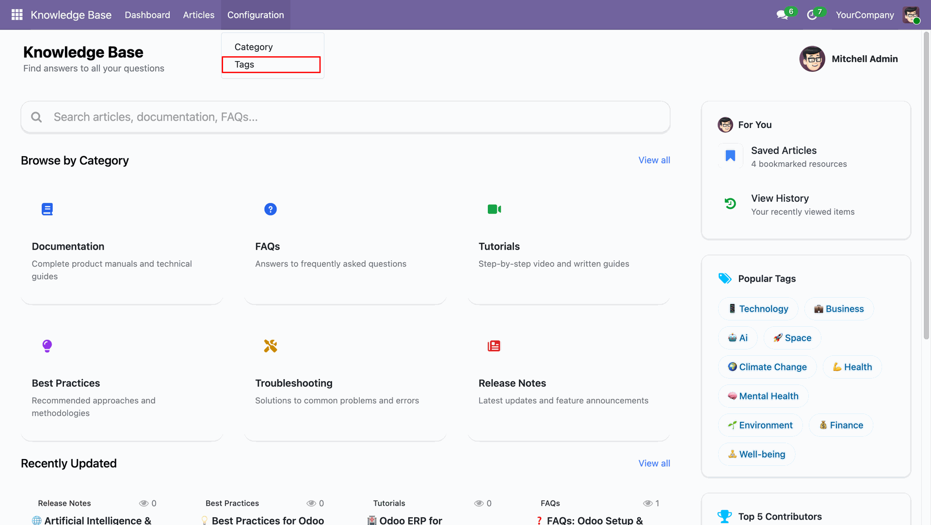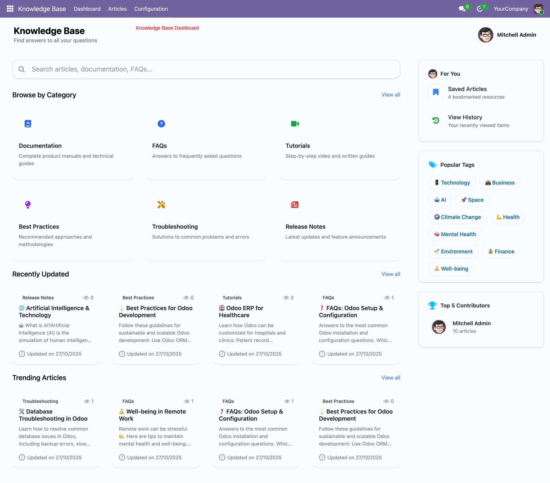 The Knowledge Base Dashboard provides an organized view with sections for browsing by category, recently updated and trending articles, personalized options like saved articles and view history, popular tags for quick filtering, and a list of top contributors.
