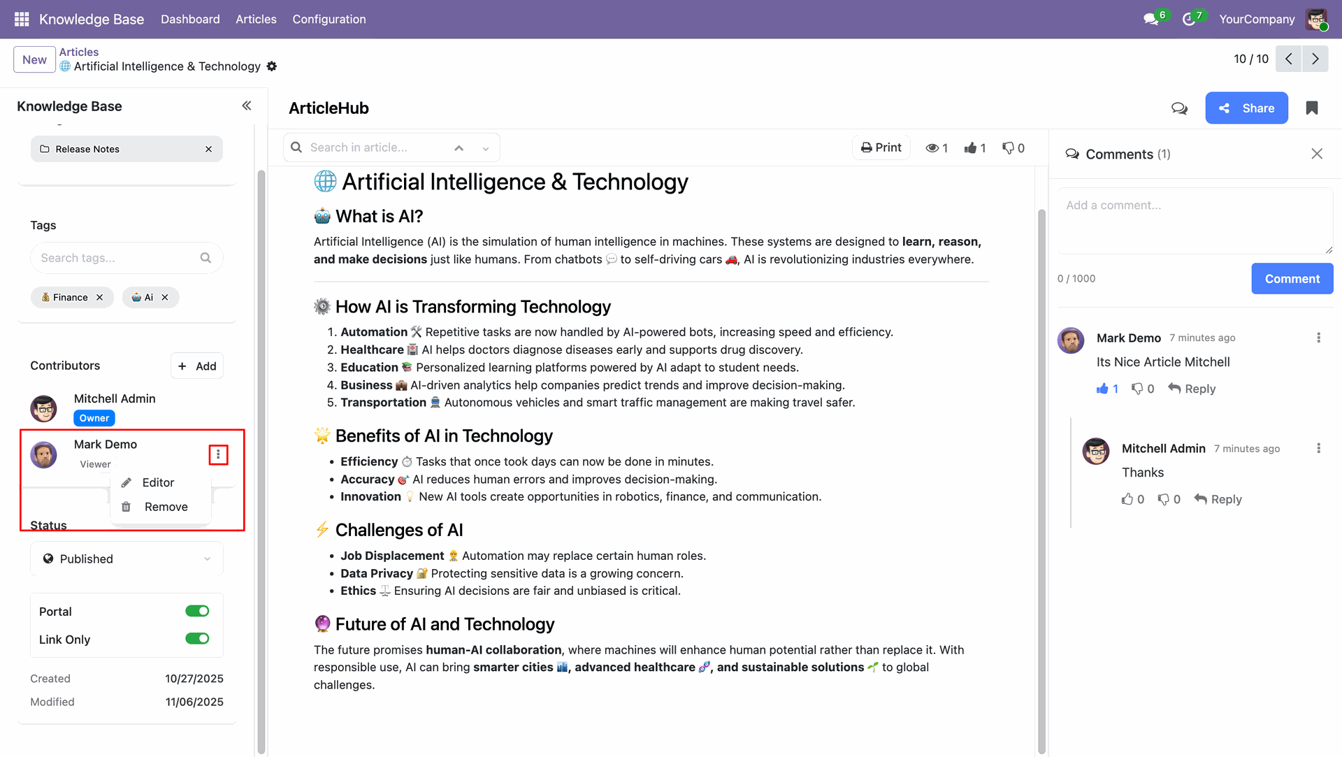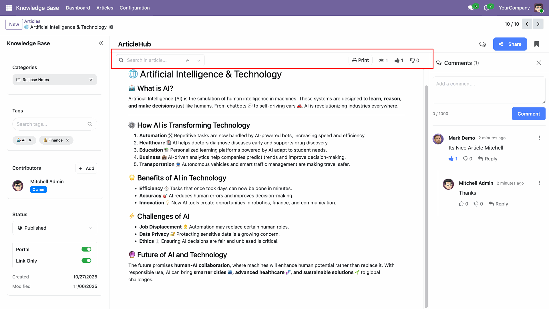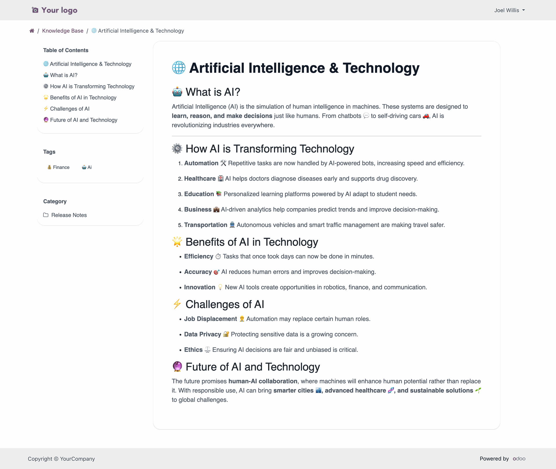 You can assign contributors as editors or viewers, manage access rights, and maintain version control by switching between draft, approval, and published states. The portal and link-only options allow flexible visibility for both internal and external readers. Collaboration is enhanced with an integrated commenting system where team members can interact, reply, and react in real time. Articles can be shared through generated links, printed, or filtered by tags and categories. Overall, this module helps organizations centralize knowledge, promote teamwork, and maintain clear, accessible documentation for ongoing learning and improvement. It is also useful for creating and maintaining Standard Operating Procedures (SOPs), ensuring consistency and clarity in organizational processes.