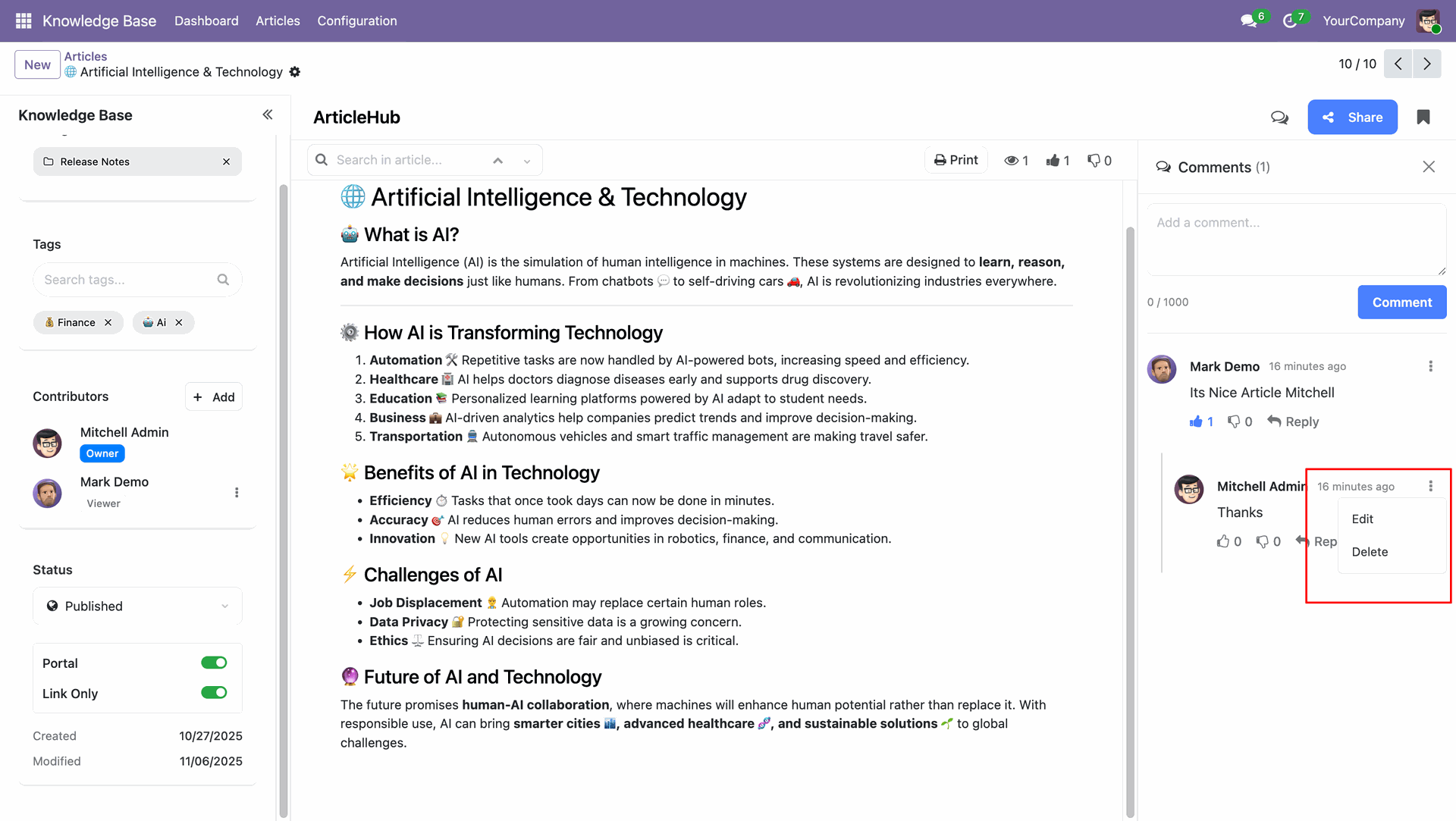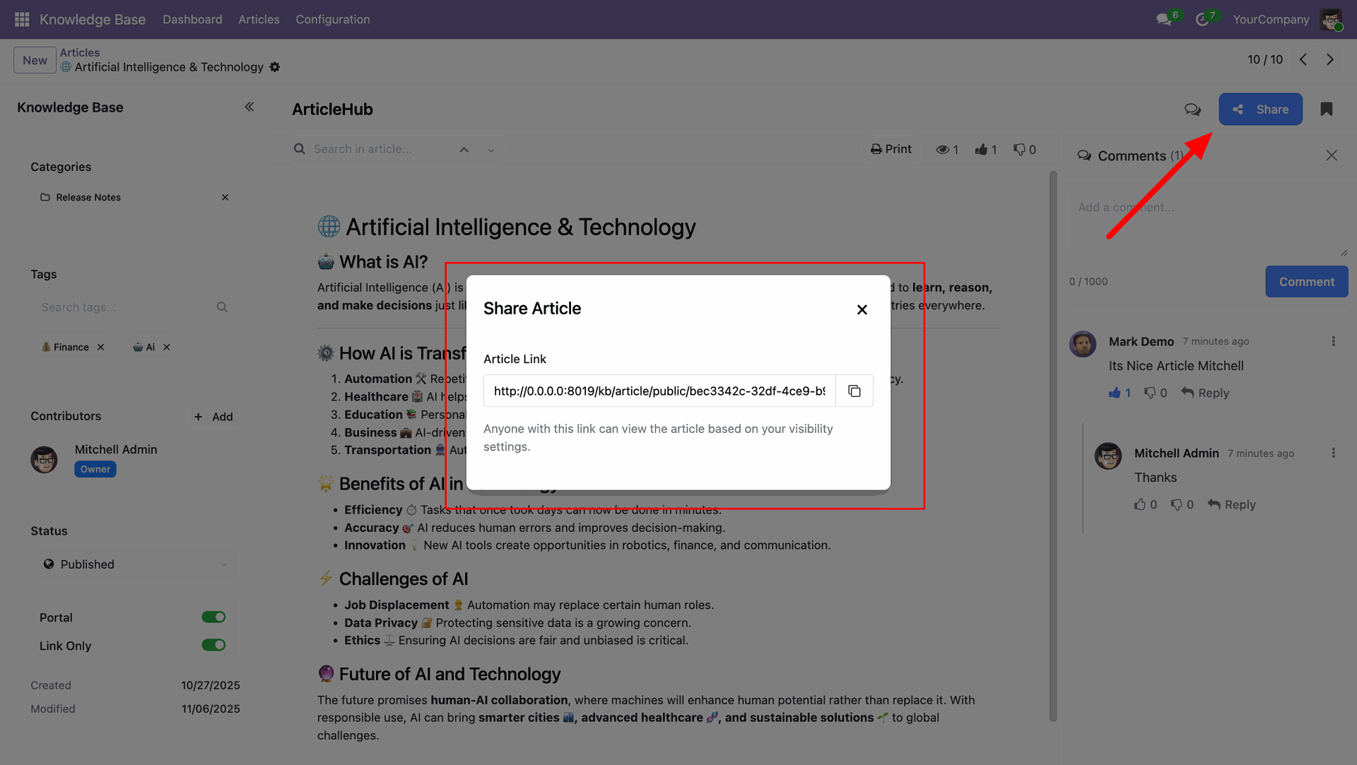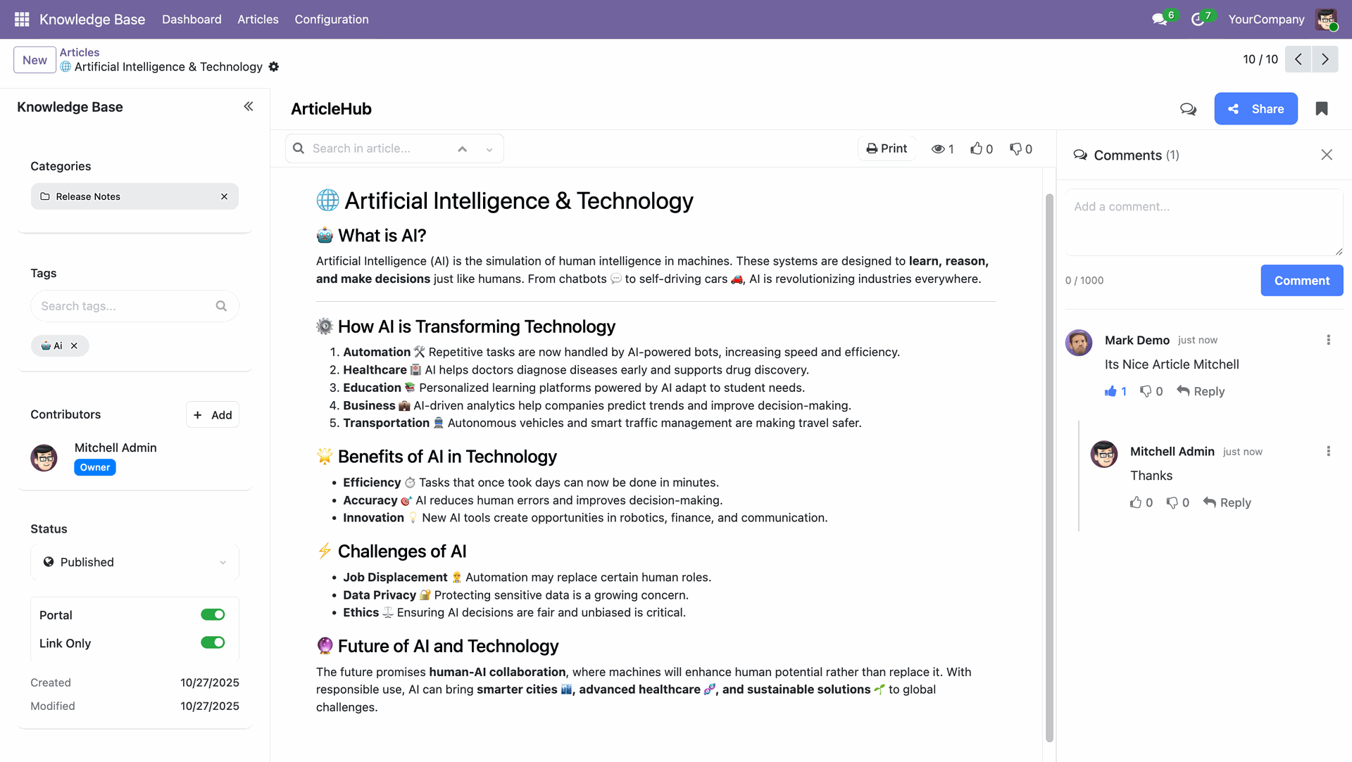 You can assign contributors as editors or viewers, manage access rights, and maintain version control by switching between draft, approval, and published states. The portal and link-only options allow flexible visibility for both internal and external readers. Collaboration is enhanced with an integrated commenting system where team members can interact, reply, and react in real time. Articles can be shared through generated links, printed, or filtered by tags and categories. Overall, this module helps organizations centralize knowledge, promote teamwork, and maintain clear, accessible documentation for ongoing learning and improvement. It is also useful for creating and maintaining Standard Operating Procedures (SOPs), ensuring consistency and clarity in organizational processes.