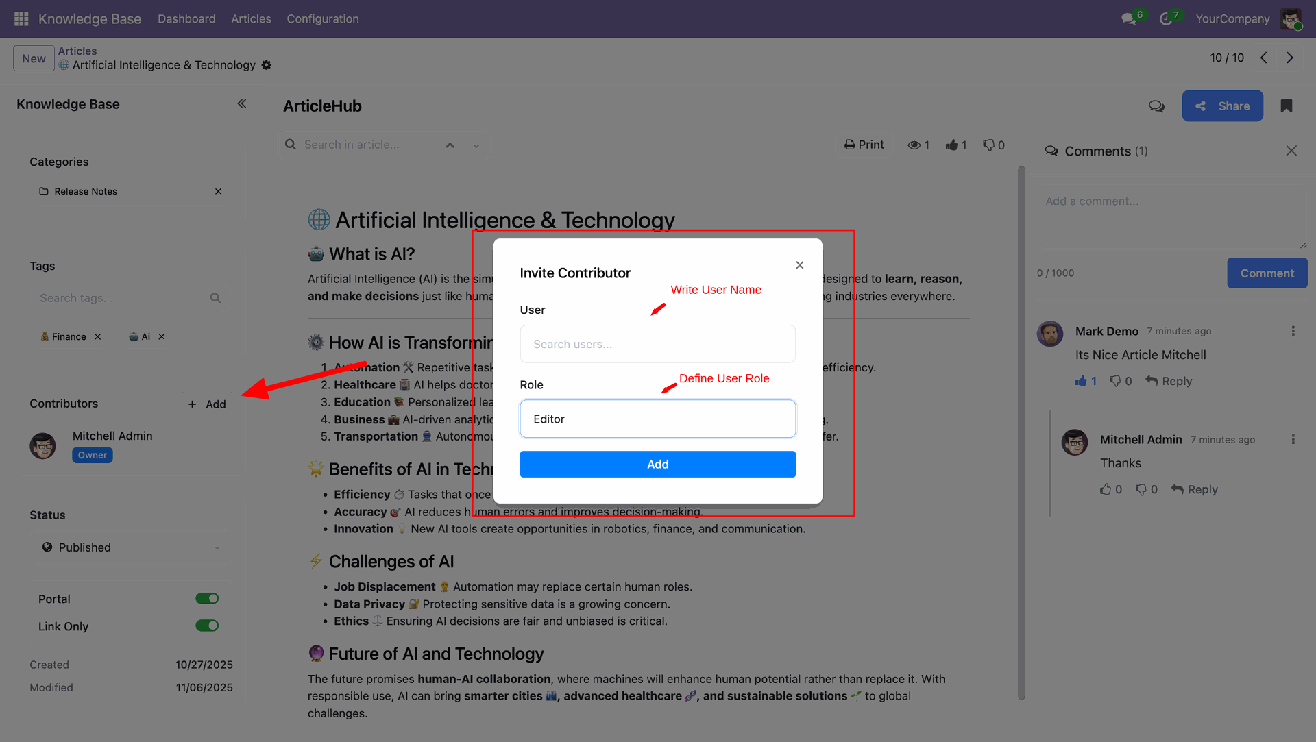 You can set the contributor role by choosing between Editor or Viewer to define their level of access before adding them to the article.
