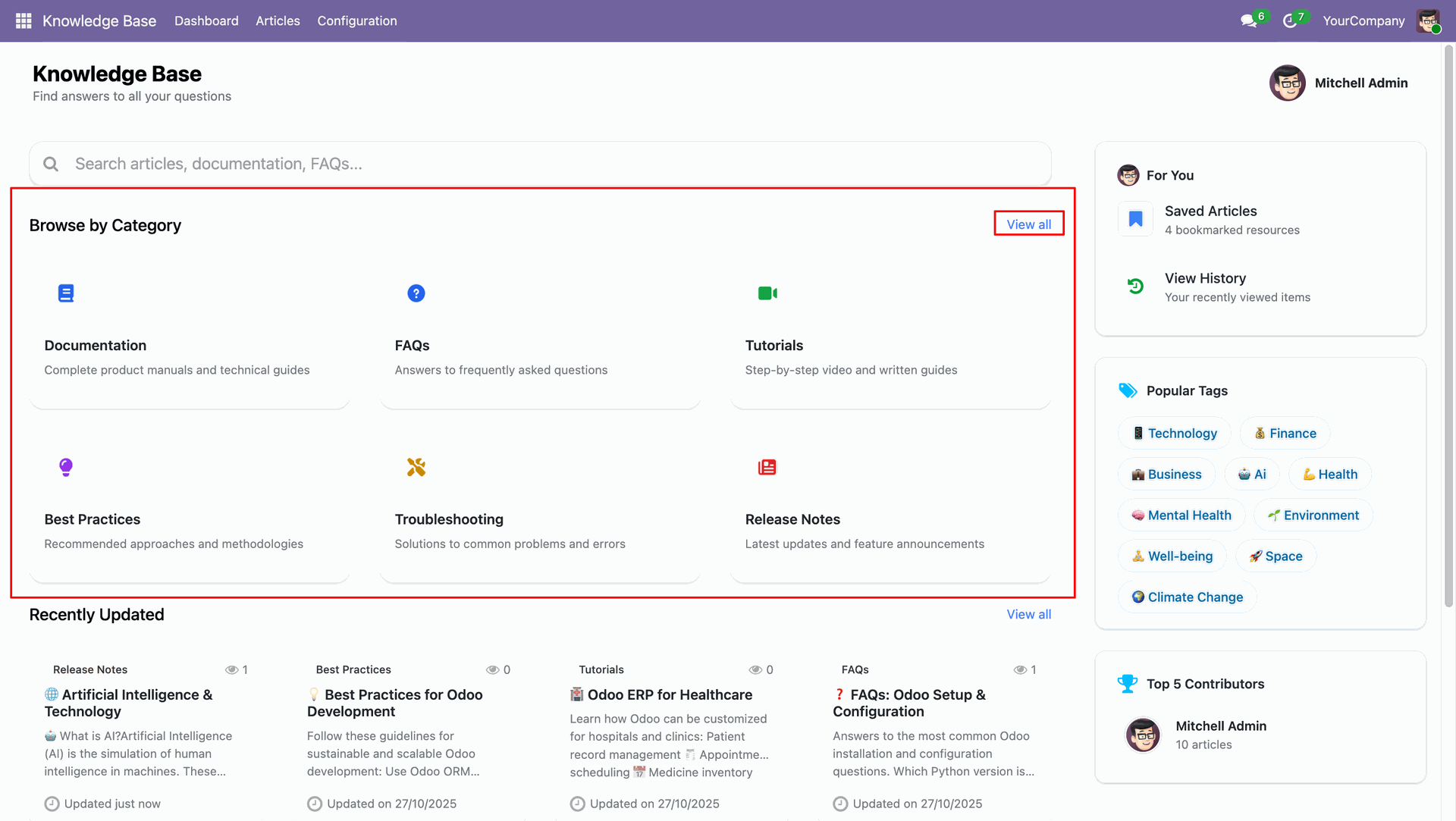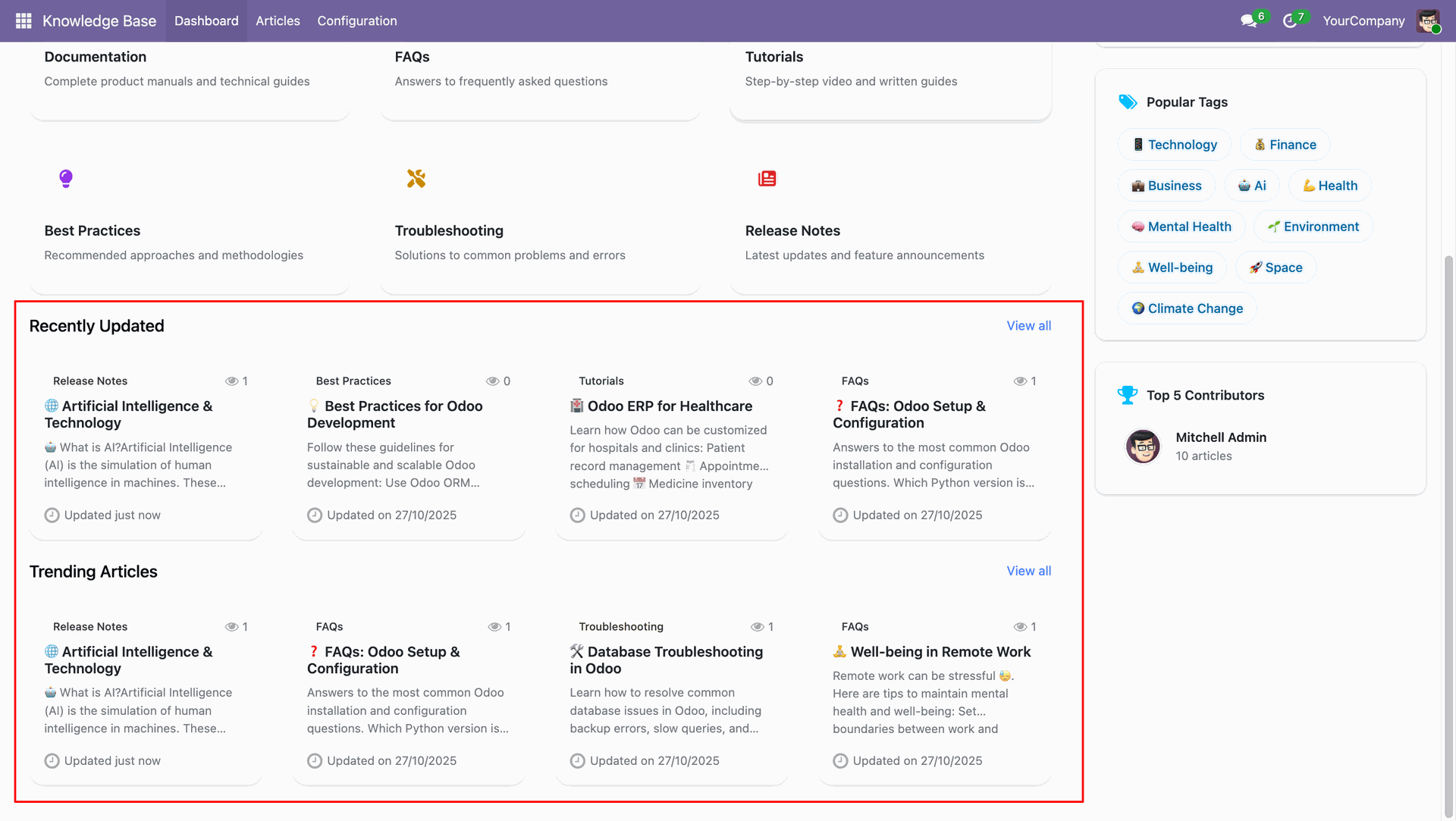 This section displays Recently Updated and Trending Articles. It highlights the latest content modifications and the most-read articles for quick access. Each card shows the article title, category, brief summary, update date, and view count. Users can click View All to explore the complete list of updated or trending articles.