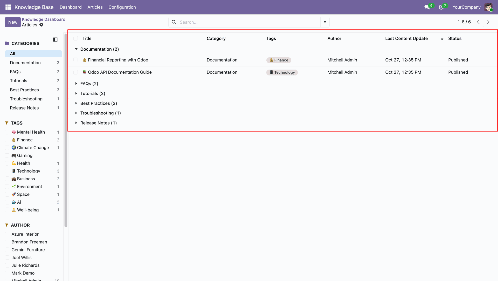 This section displays all knowledge base articles organized under their respective categories. Each record shows the article title, category, associated tags, author, last updated date, and publication status. Users can easily expand or collapse categories to view related articles for better navigation and management.