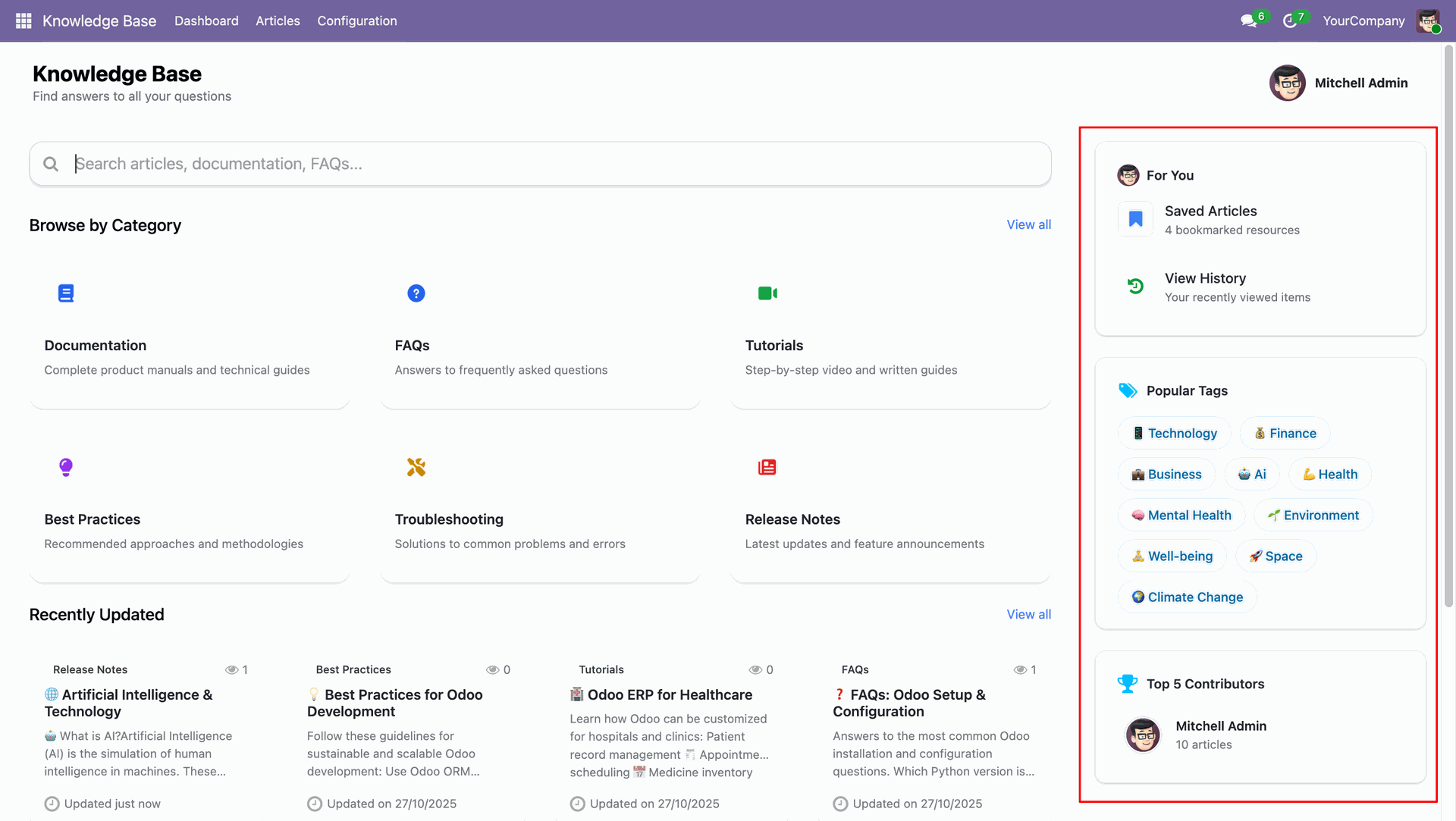 The Knowledge Base System module provides a collaborative space where teams can create, manage, and share information efficiently. It enables users to build articles, tags, and contributor roles to ensure smooth knowledge sharing across departments. Each article supports structured content with headings and formatted text, giving an engaging and easy to read experience.