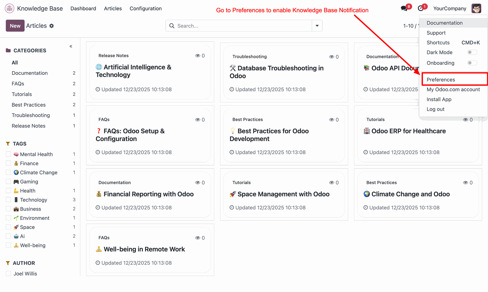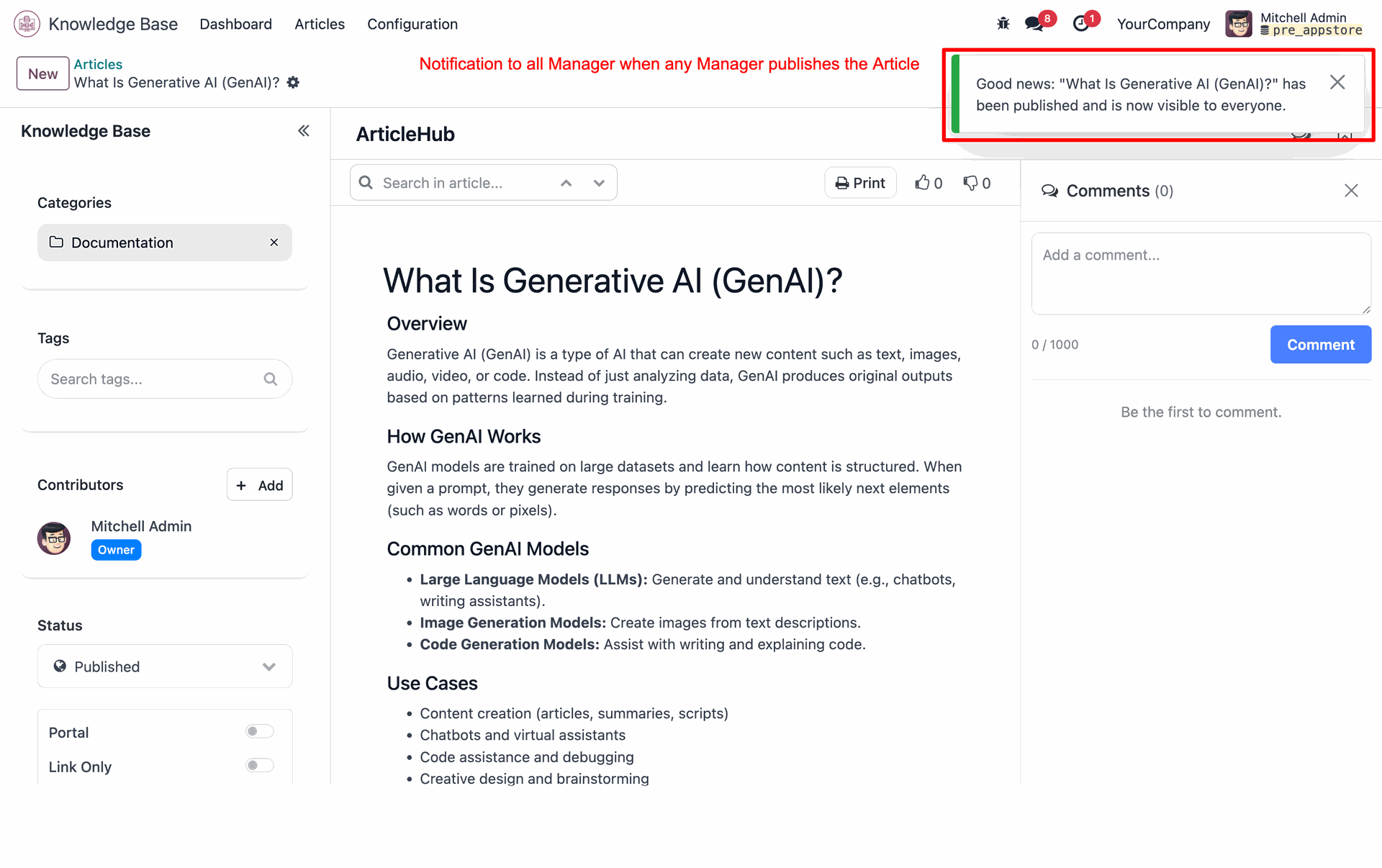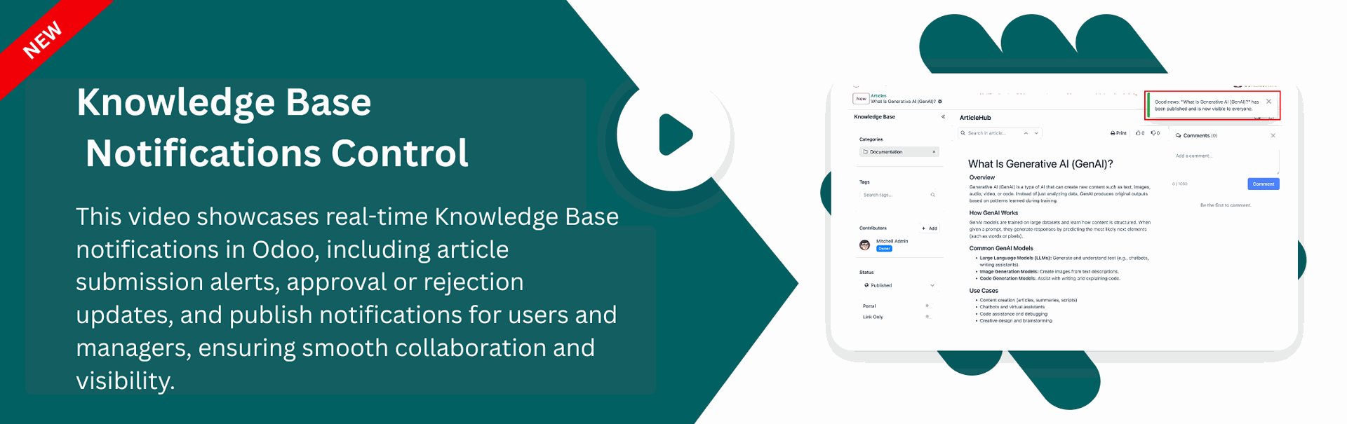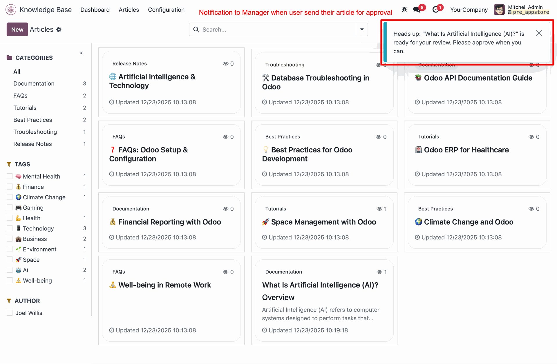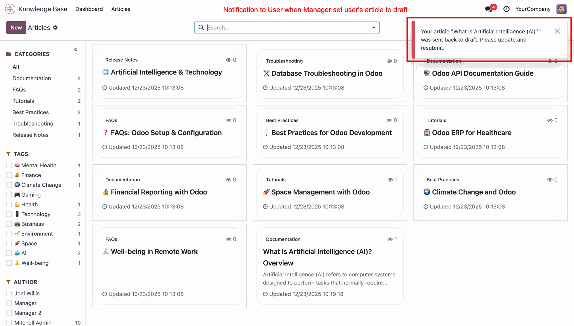 Notifications are intelligently triggered based on user roles such as User, Manager, and Admin. Automatic notification is sent to the author once the manager approves and publishes the article. All managers are notified when any manager publishes a Knowledge Base article. Managers receive instant notifications when a user submits an article for review. Users are notified immediately when their article is sent back to draft with feedback. Notifications appear instantly inside Odoo without page refresh or manual tracking.