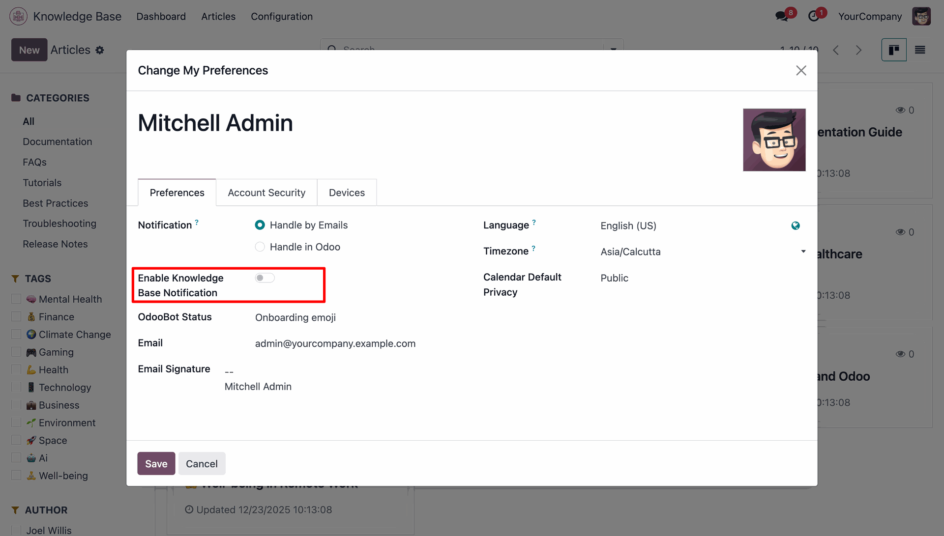 Users can enable or disable Knowledge Base notifications directly from their personal settings.