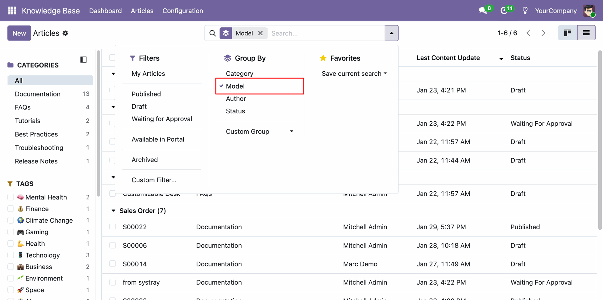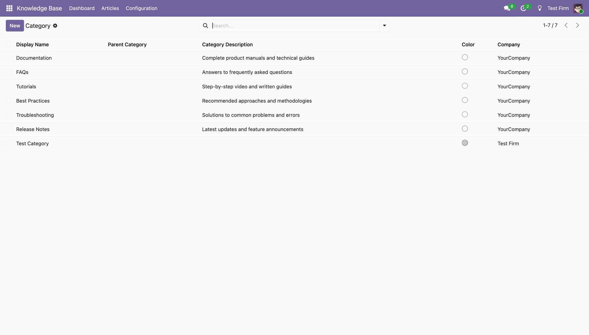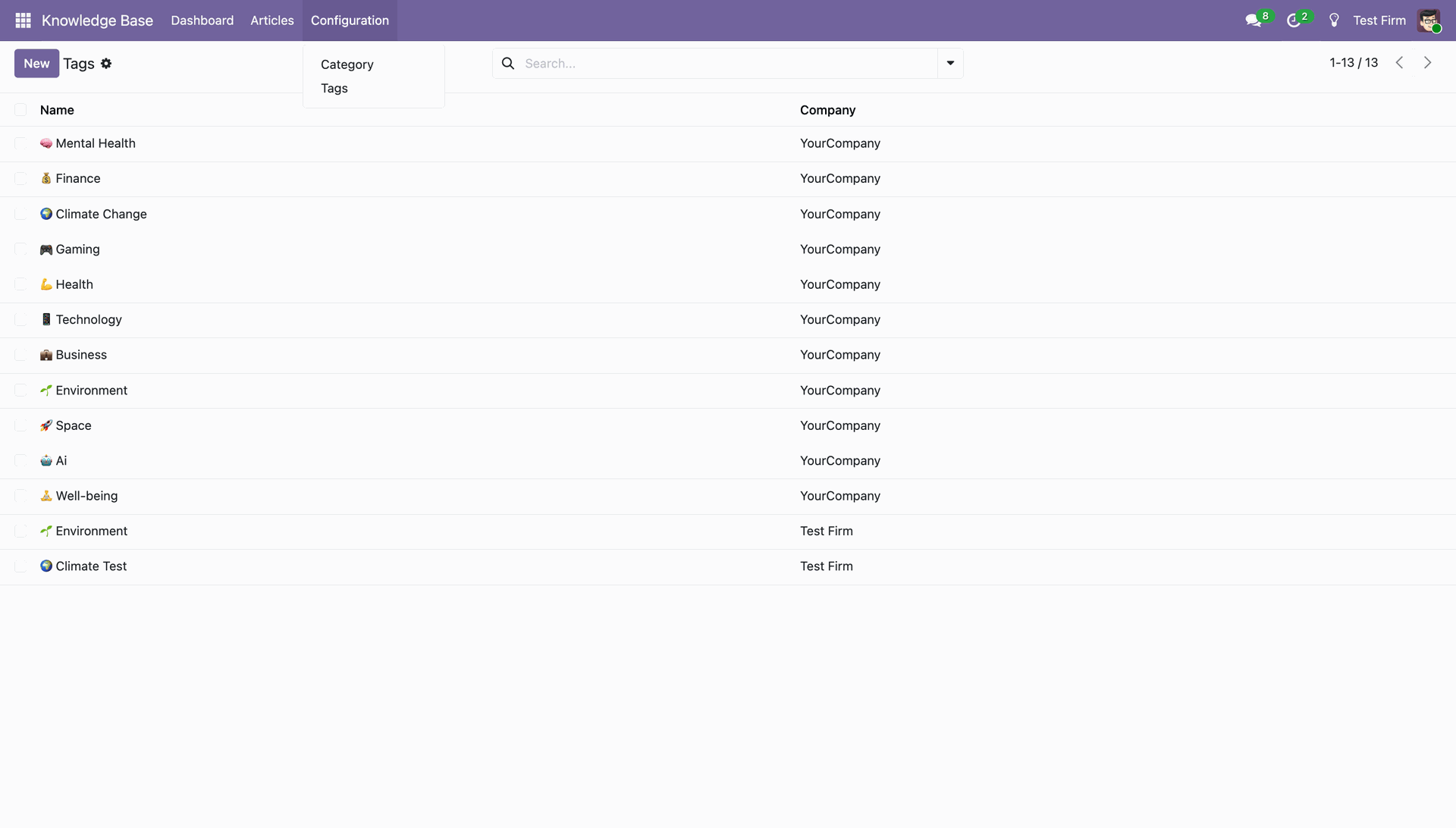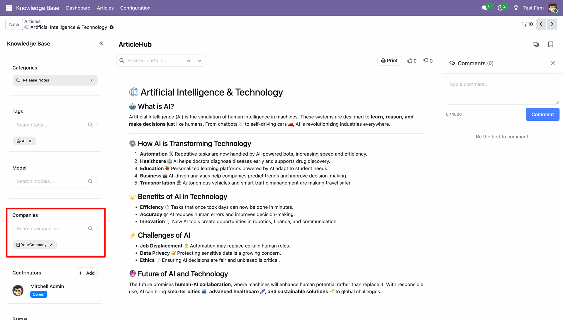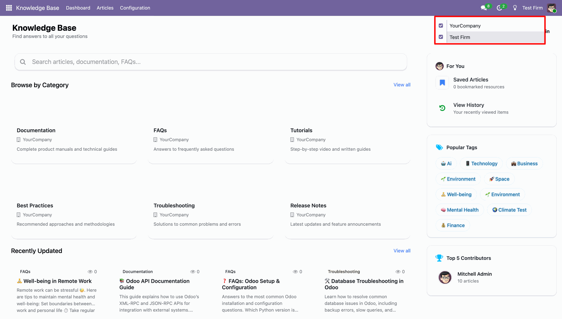Control knowledge base articles per company, allowing users to view and maintain content multi-company-wise. Ensuring relevant tags and categories are on the active company,