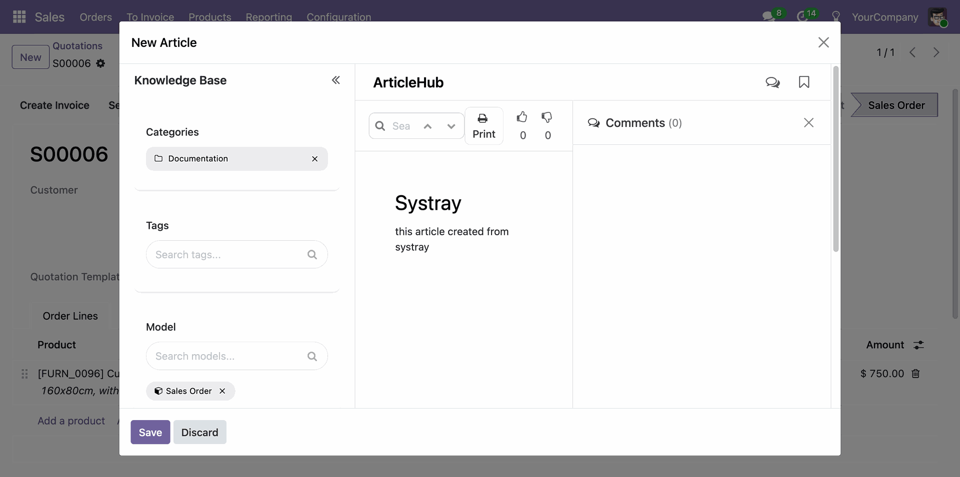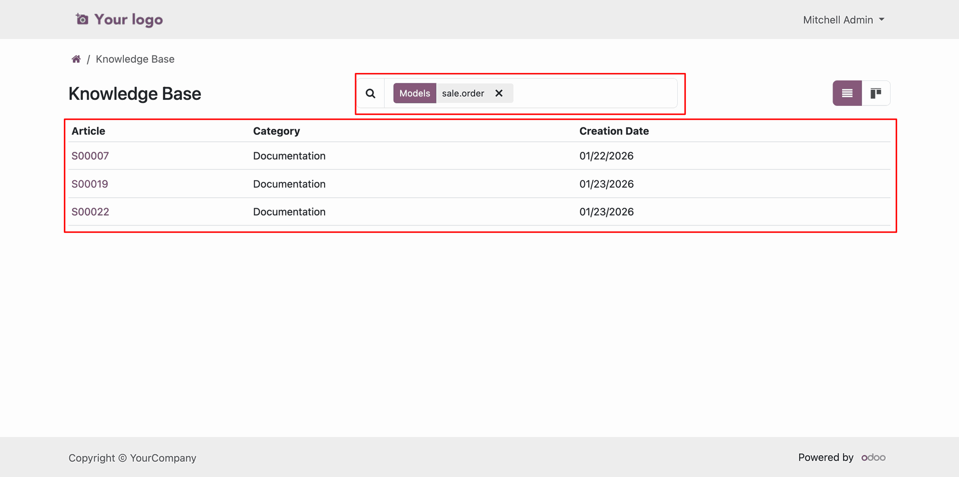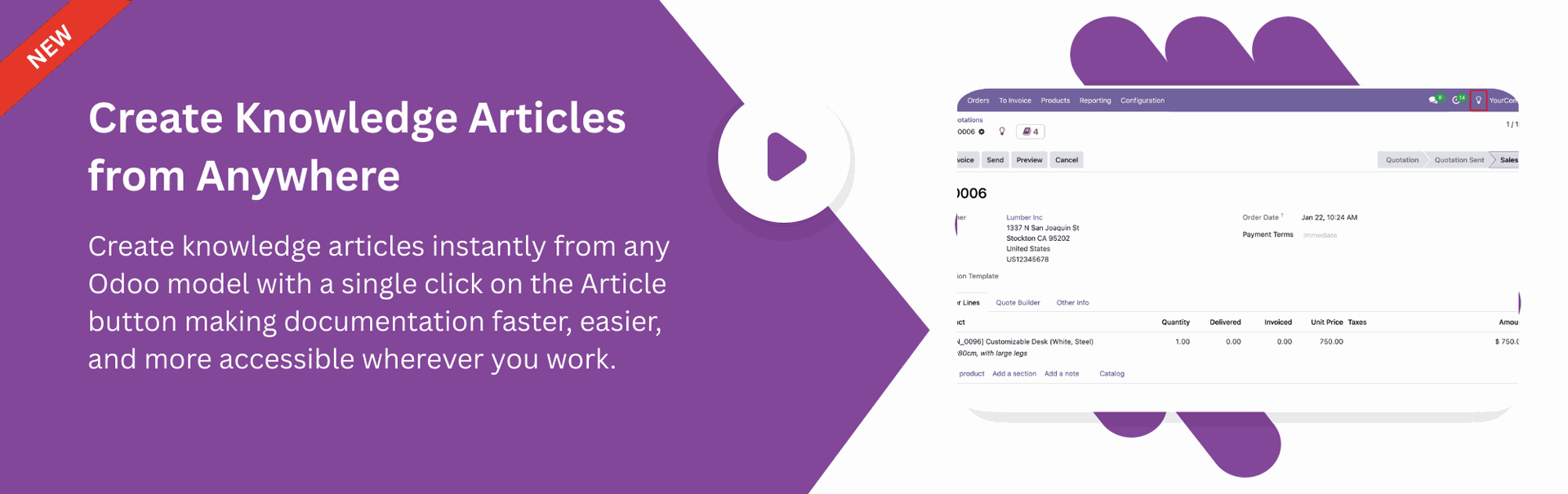Create Knowledge Articles from any Odoo model with a single click on the Article button for quick and easy documentation.