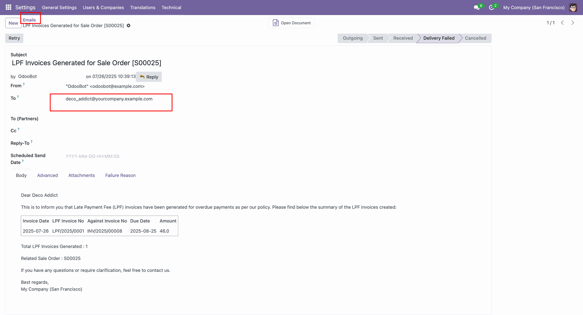 Form view of the email.