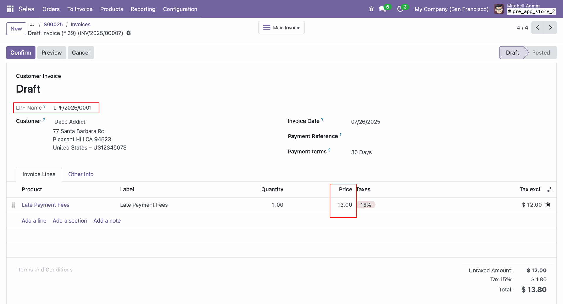 In the main invoice form view, you can see the LPF invoice details under the "LPF Invoices" tab.