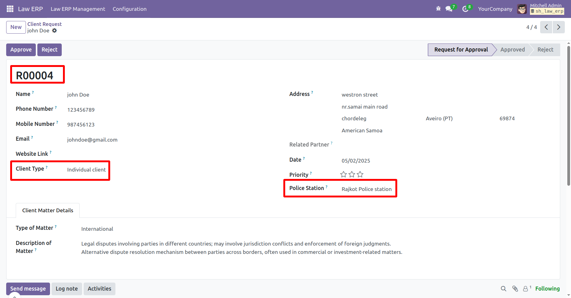 Form view of the 'Client Request'. Add the Client Type and Police Station.
