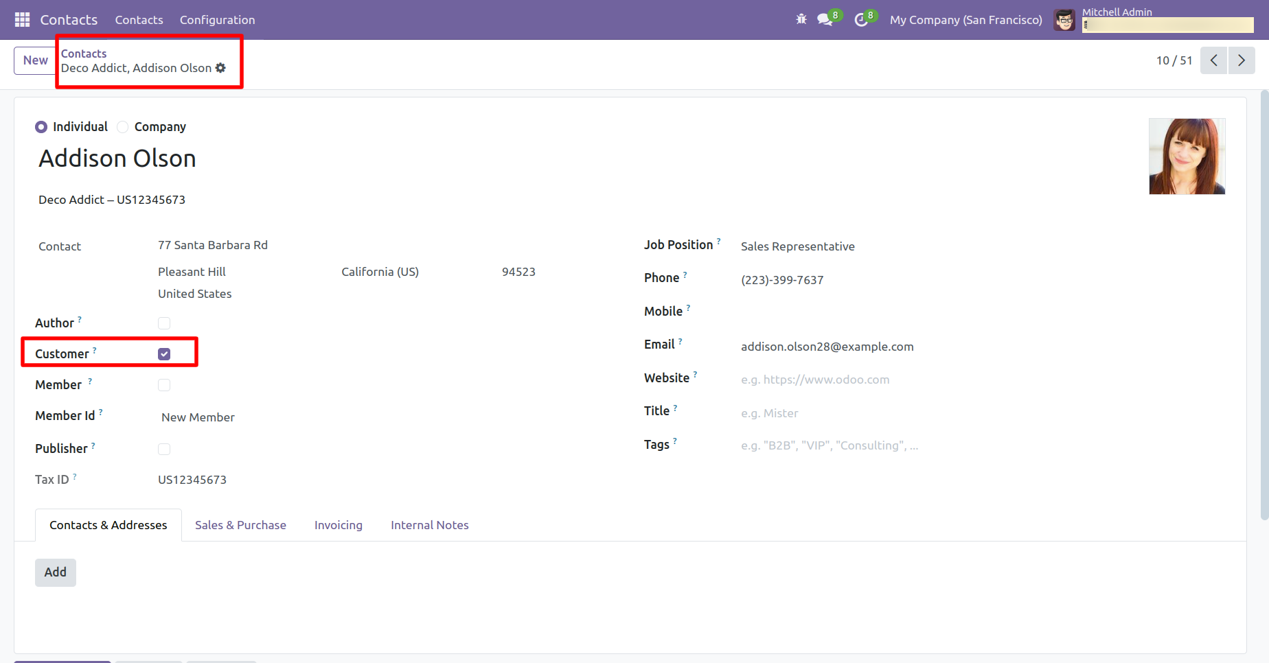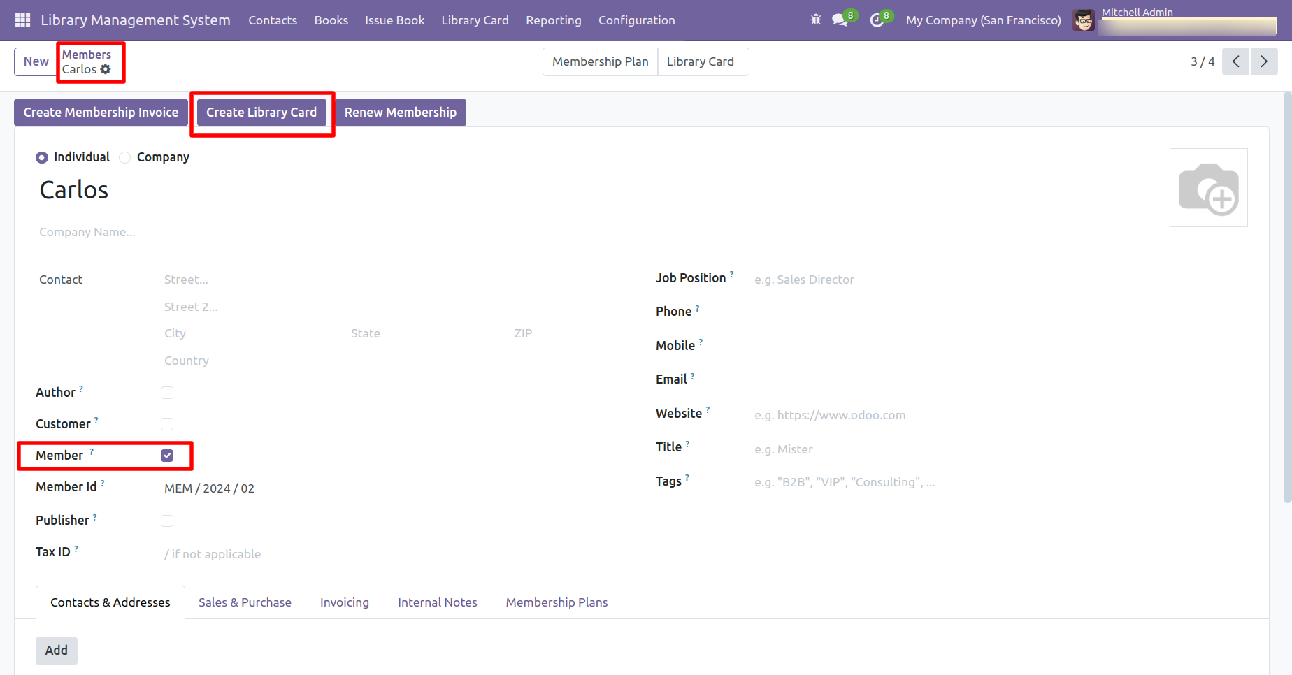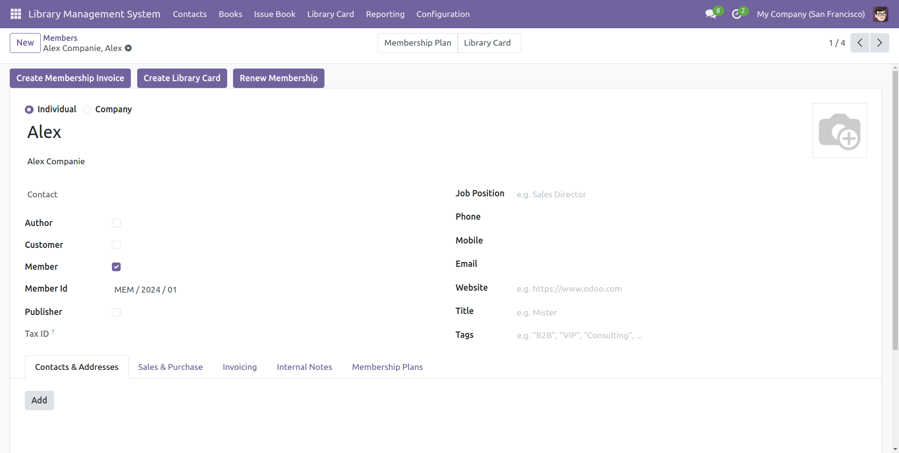 Form view of the 'Contacts'. Tick the contact type: Author or Customer or Member, or Publisher.