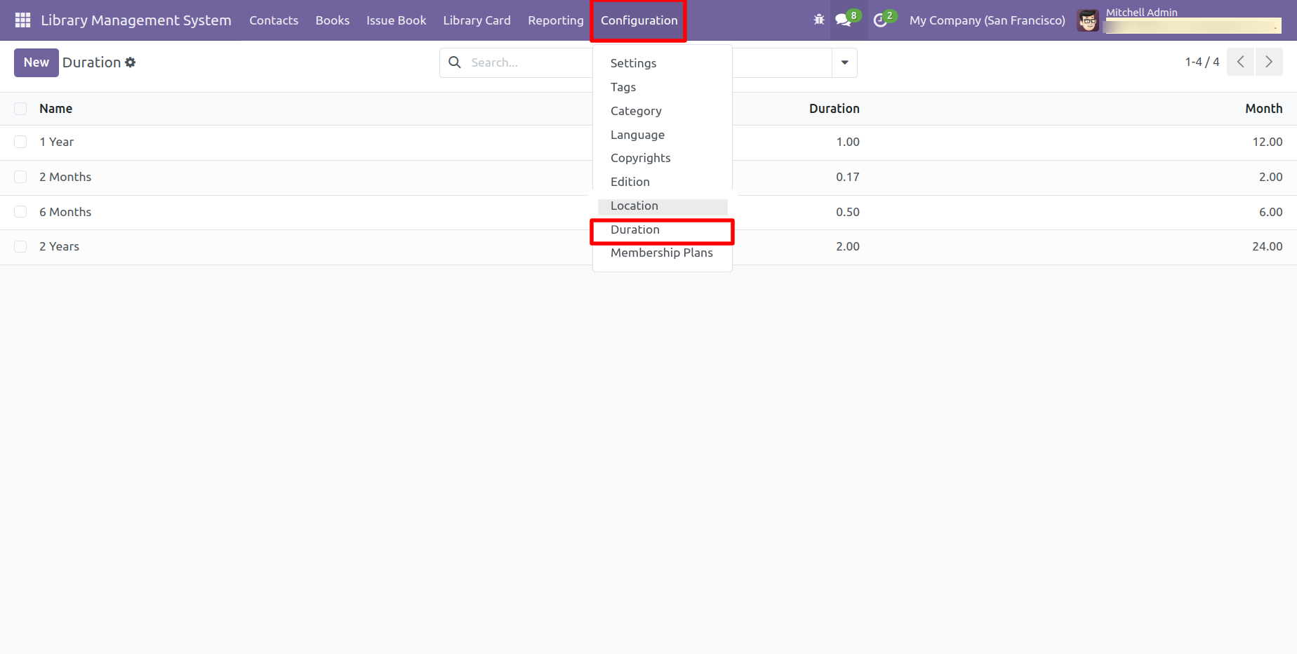 Form view of the 'Duration'.