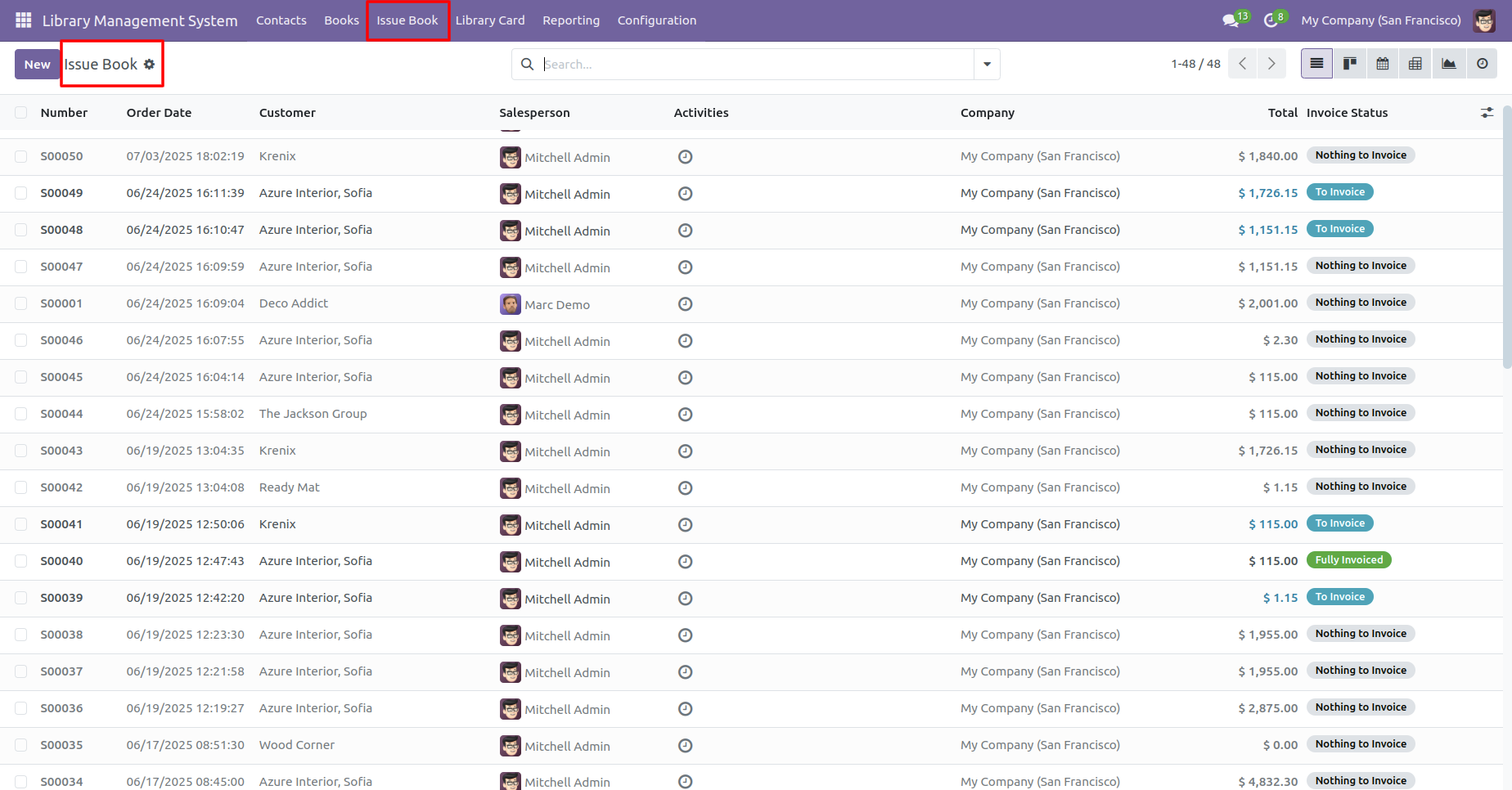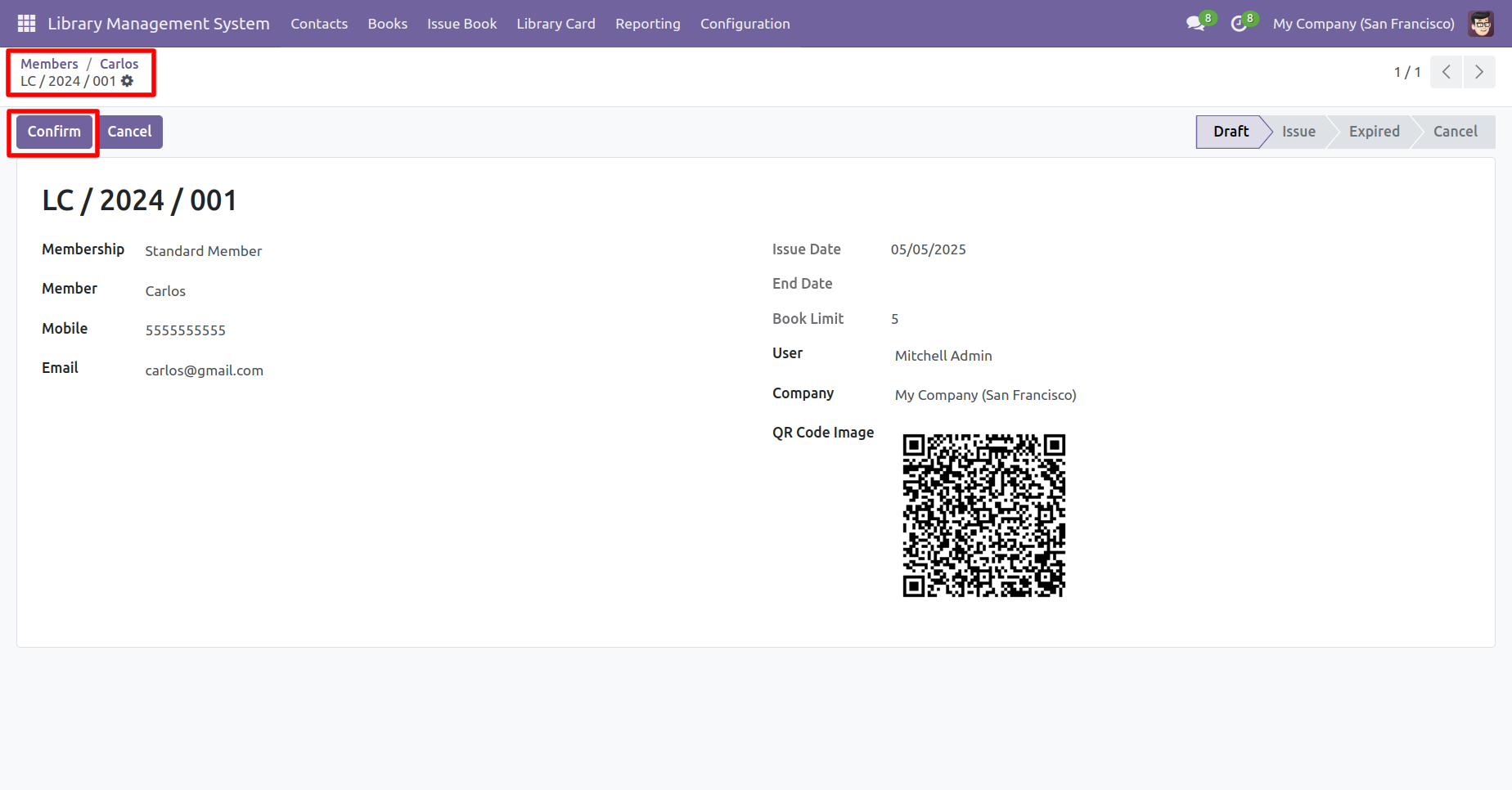 Form view of the issue books. Add a book and click on the 'Confirm' button.