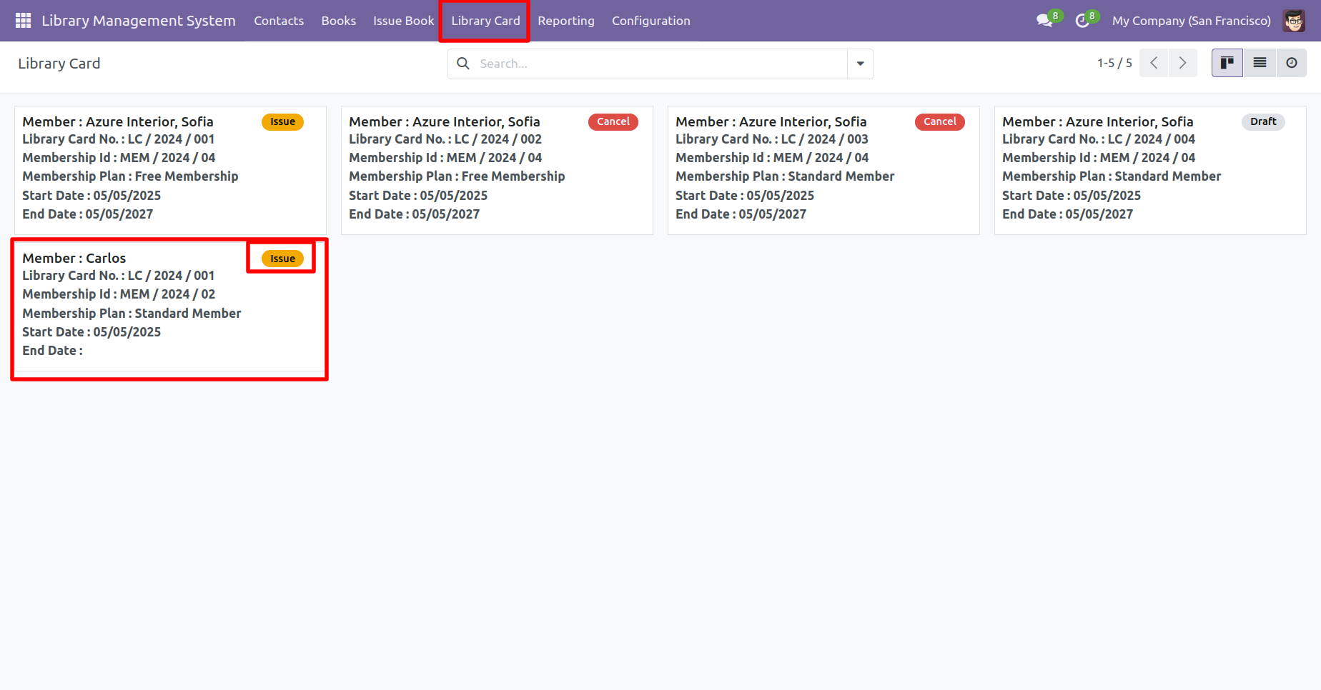The issued library card for the member can be viewed in the Library Card menu.