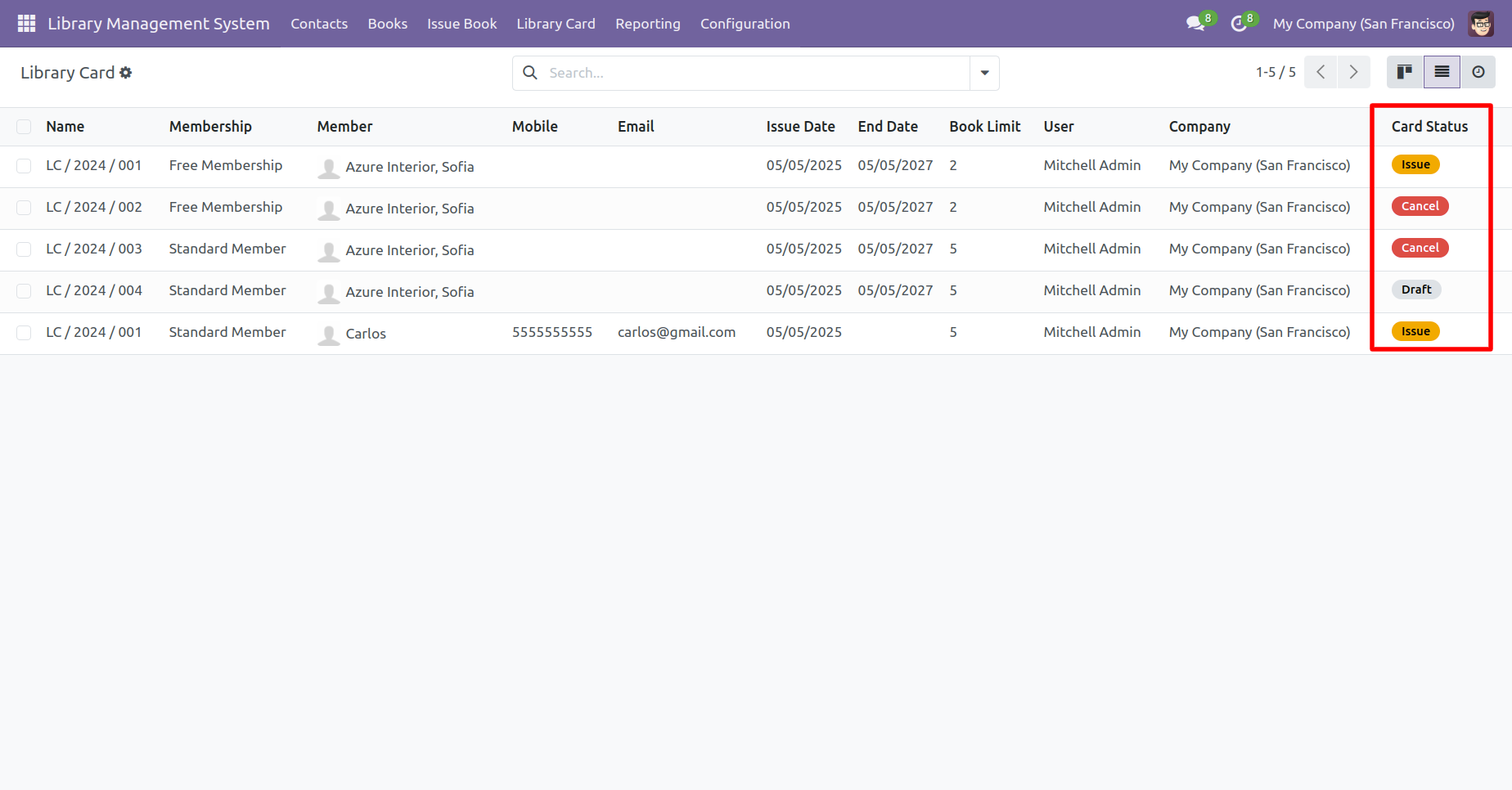 In the 'Library Card' tree view, you can view the status of each card.