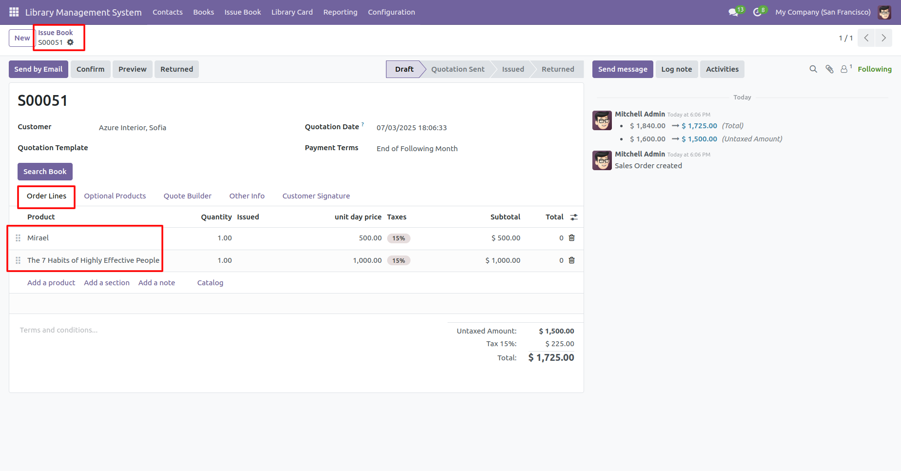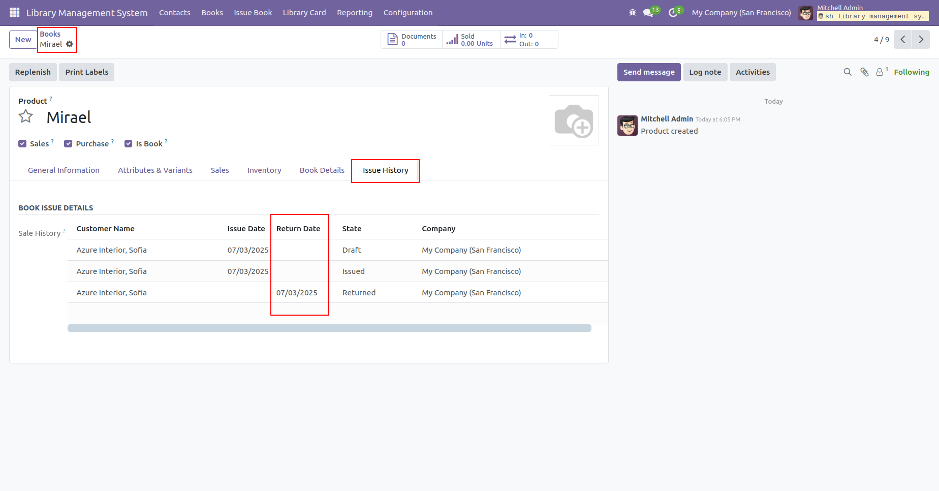Form view of the books. In the 'Issue History' tab, you can see the return date of the book.
