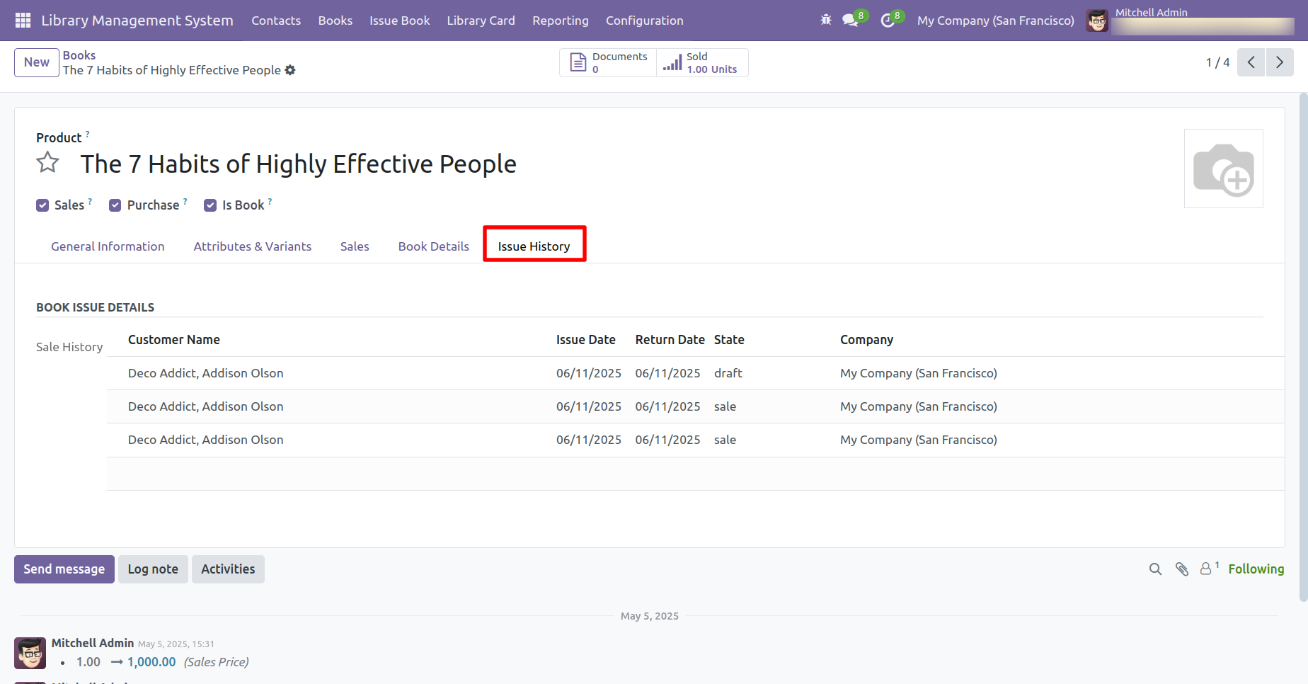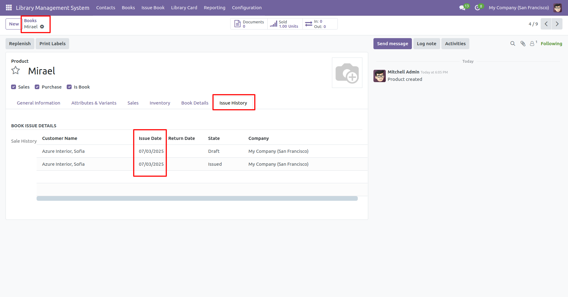 Form view of the books. In the 'Issue History' tab displays the date the book was issued.