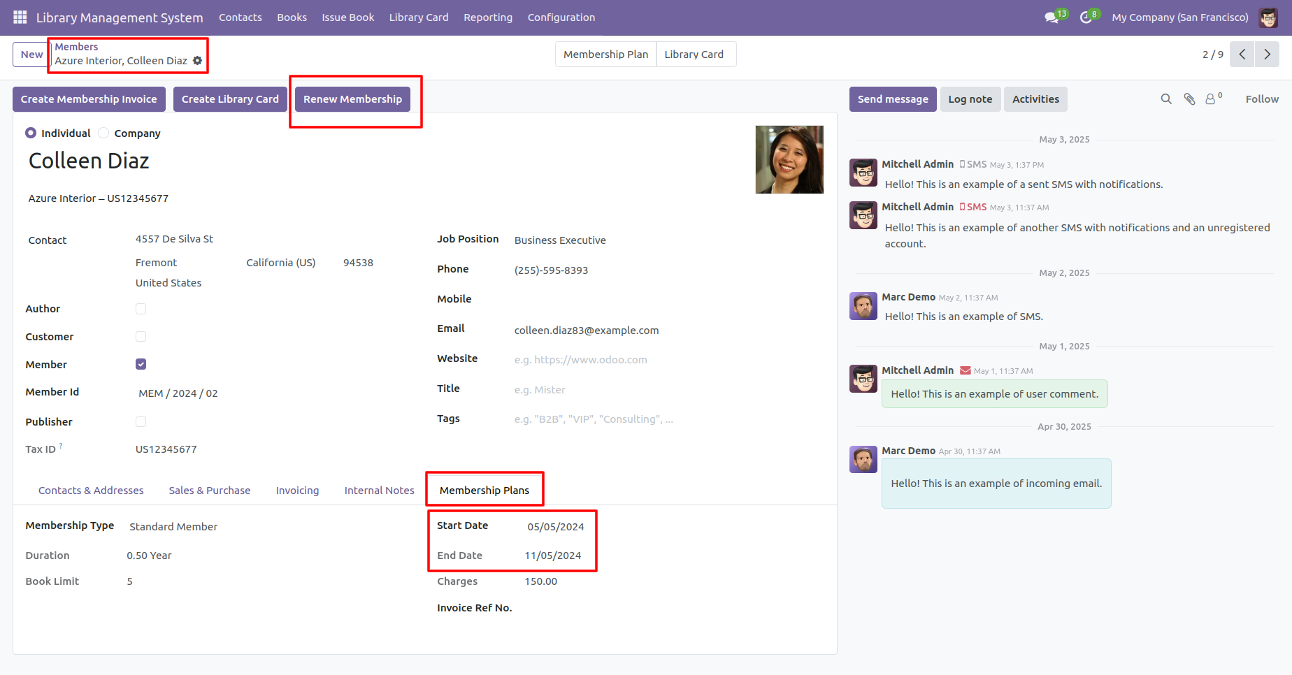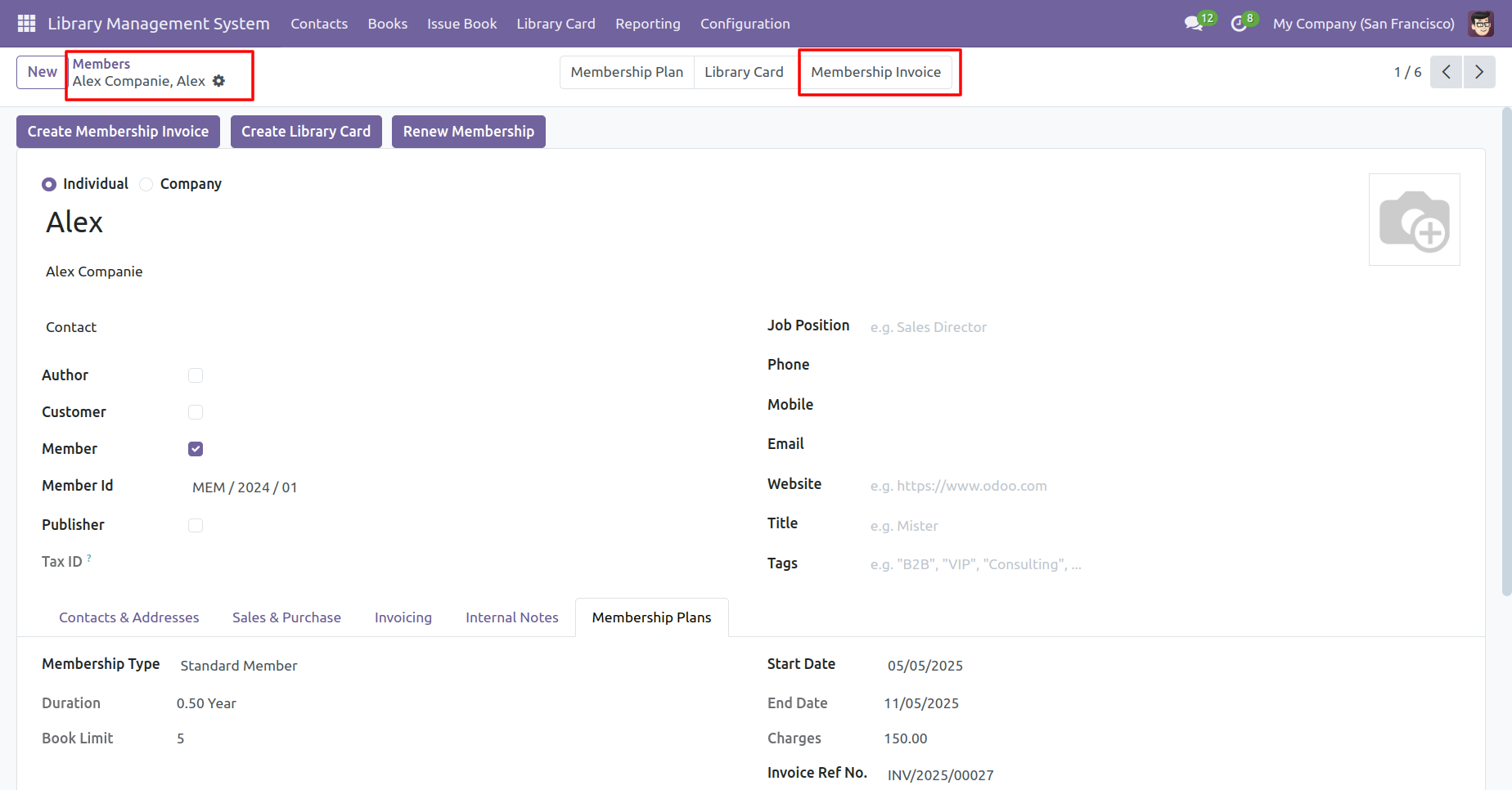 Form view of the 'Members'. You can see the membership plan in the 'Membership Plans' tab.