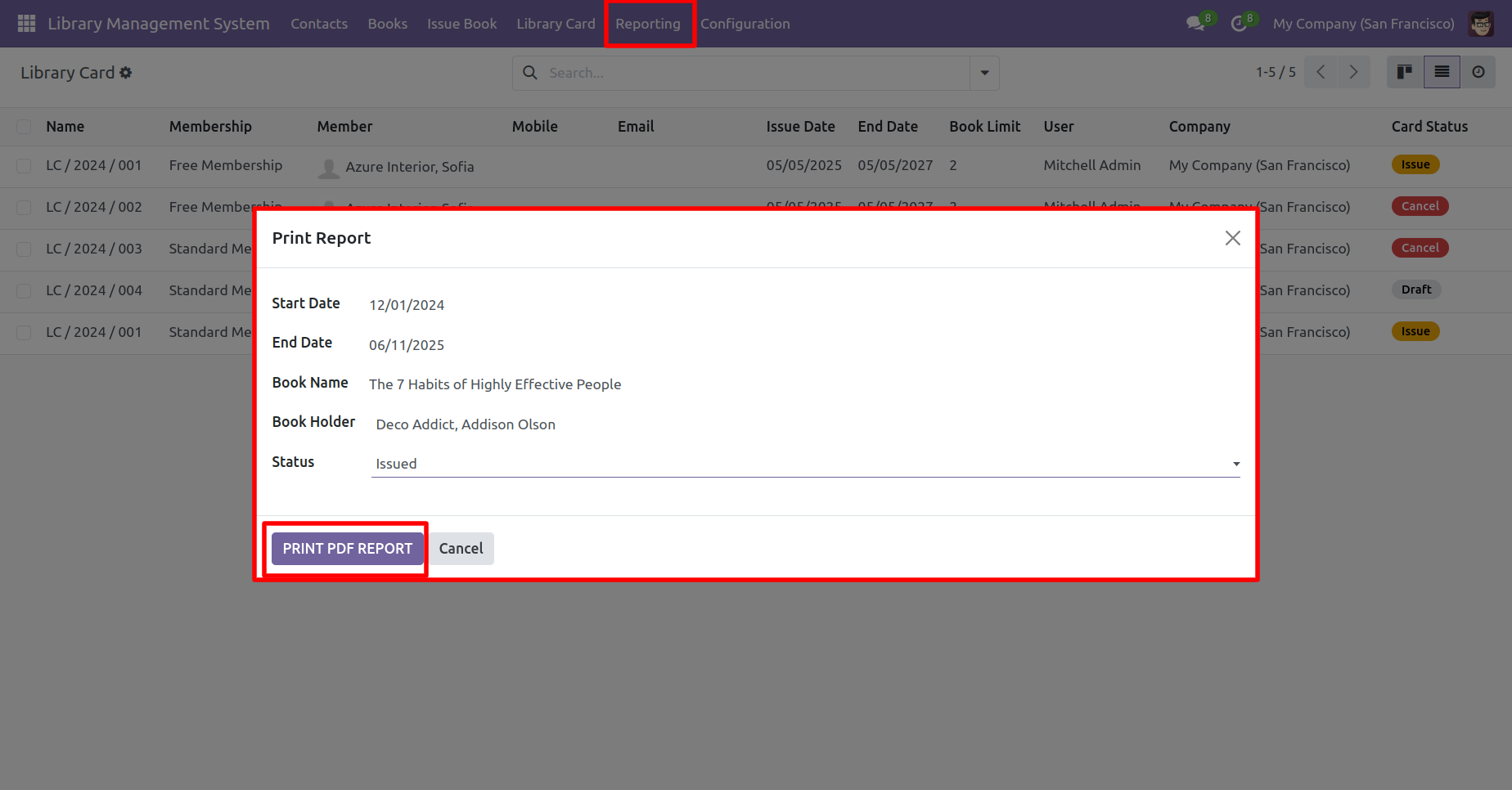 To print the issued books report, click on the 'Reporting' menu.