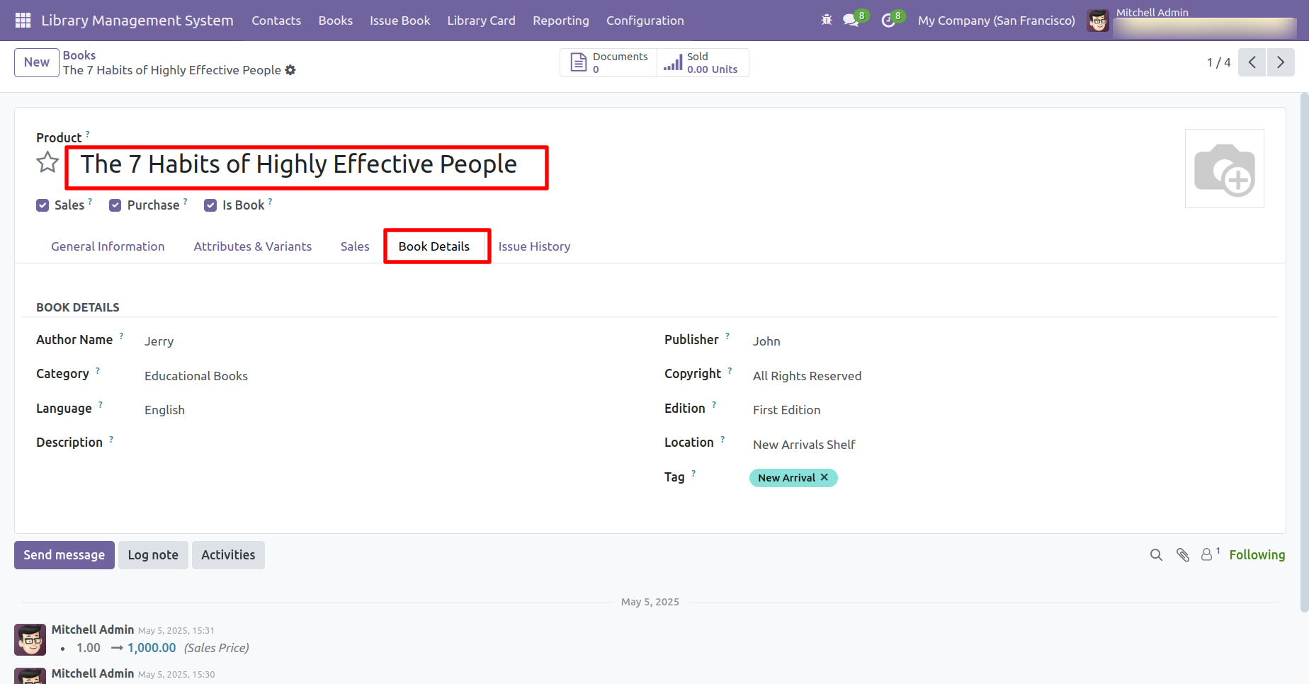 This is the form view of the 'Books'. All book-related information can be found under the 'Book Details' tab.