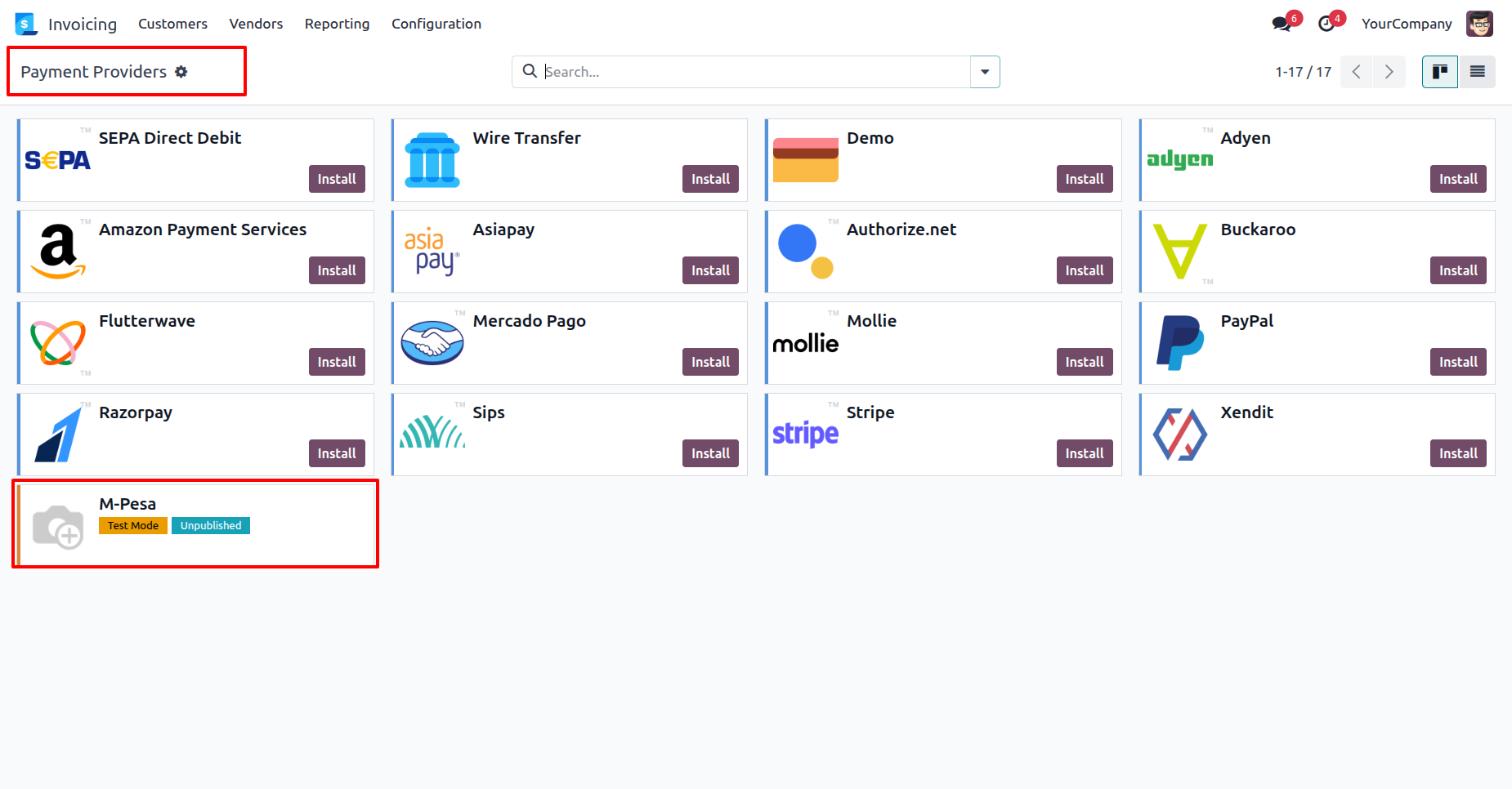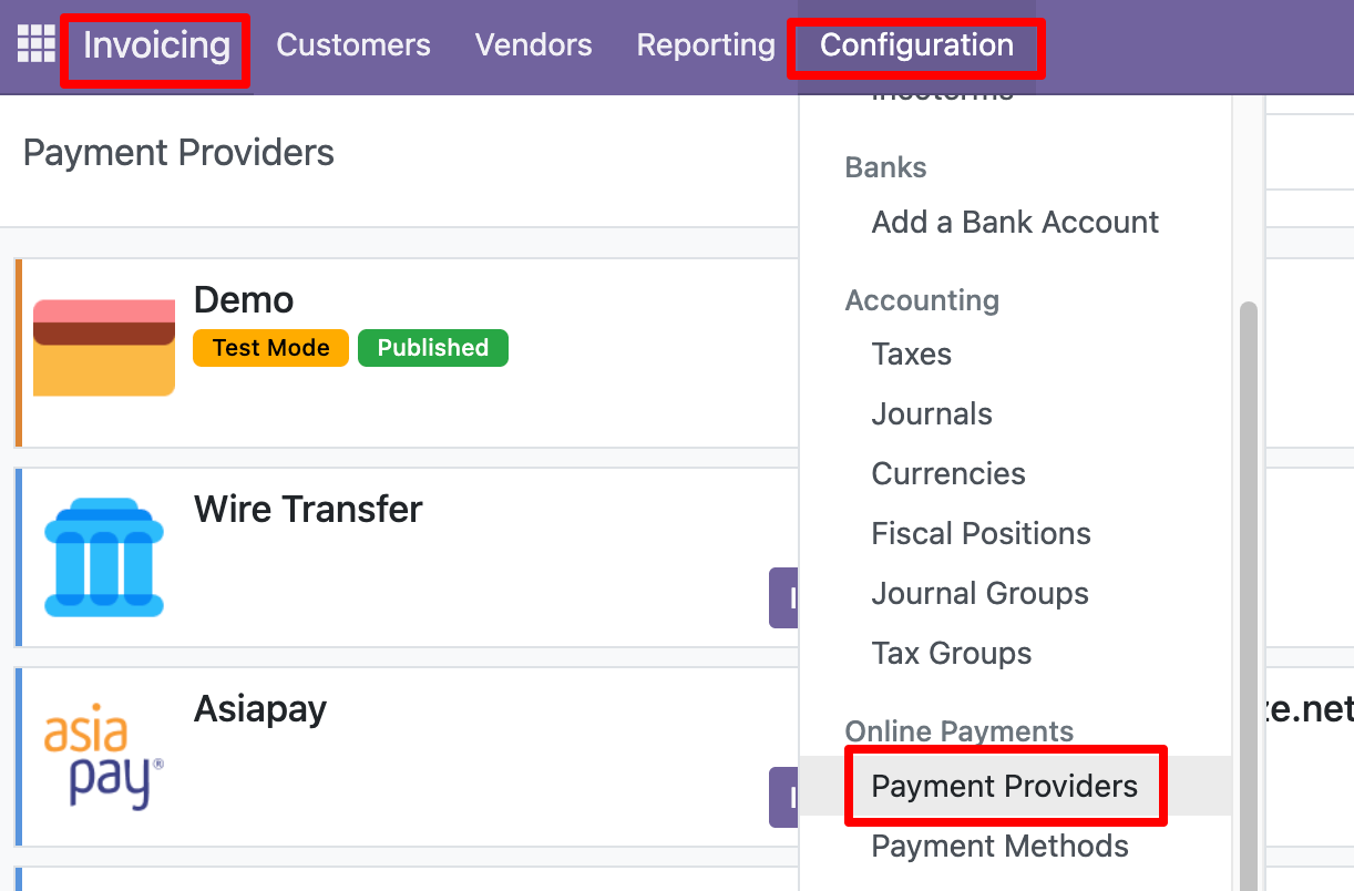 Go to the Invoice/Account -> Configuration -> "Payment Provider"