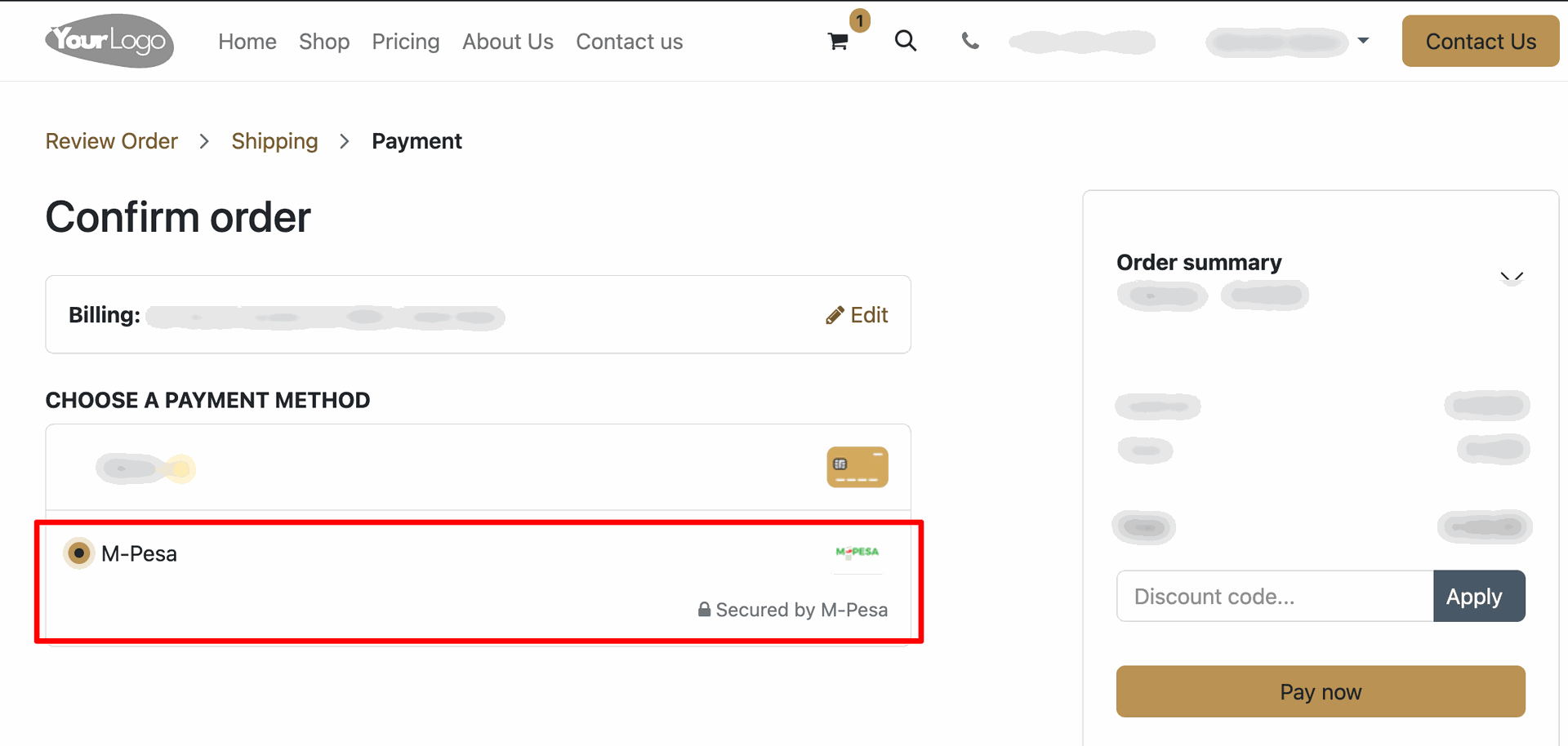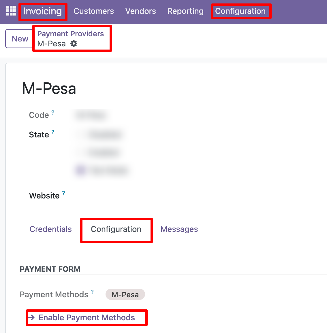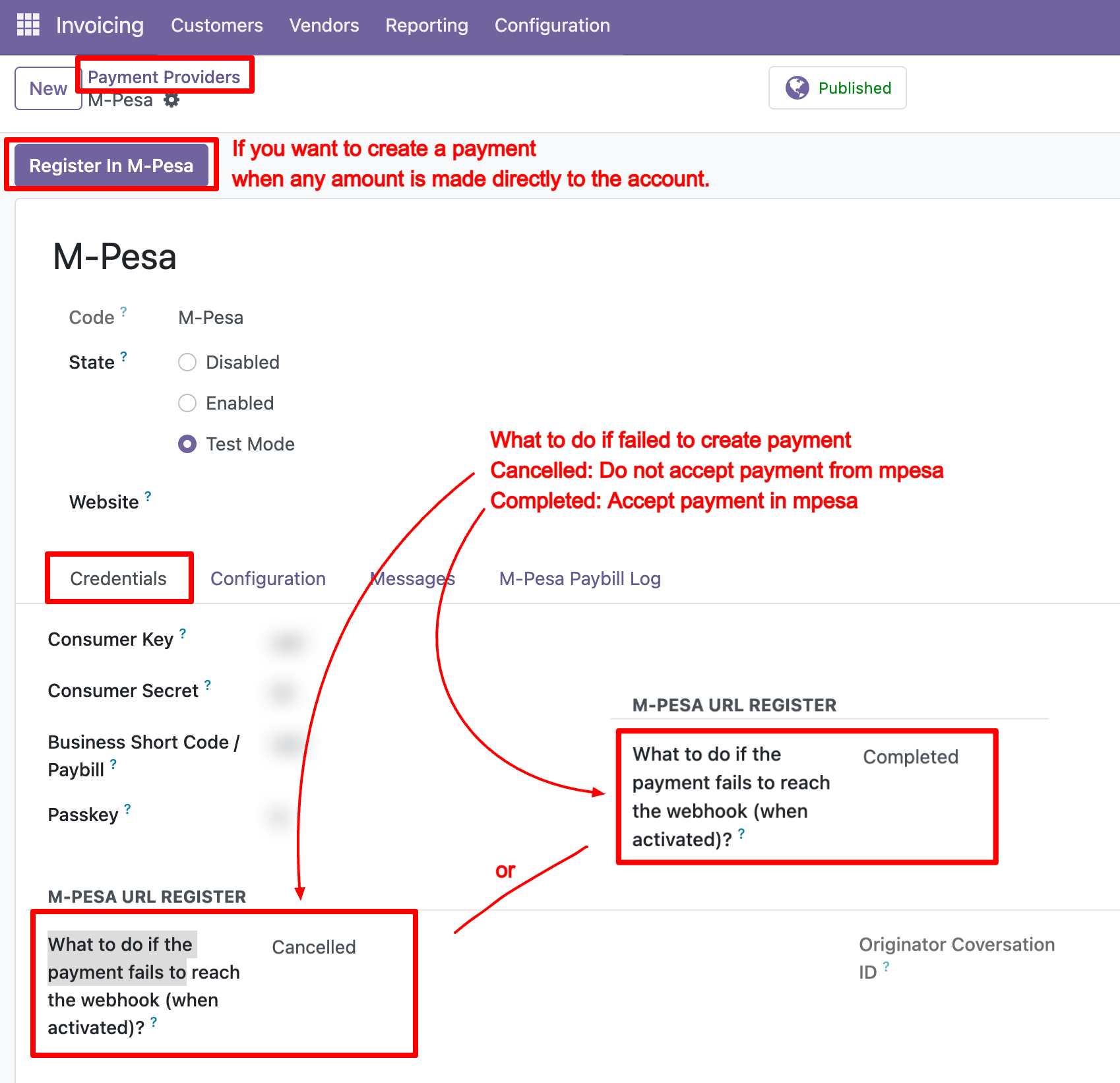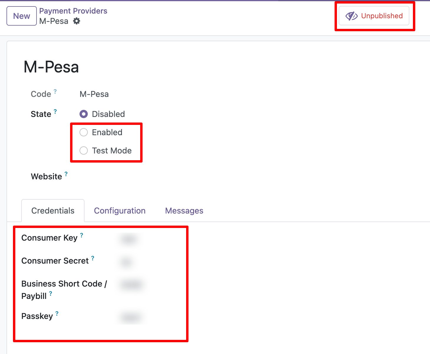 Enter the credentials (Customer Key, Consumer Secret, Business Short Code/Paybill, and Passkey) obtained from the M-Pesa portal.