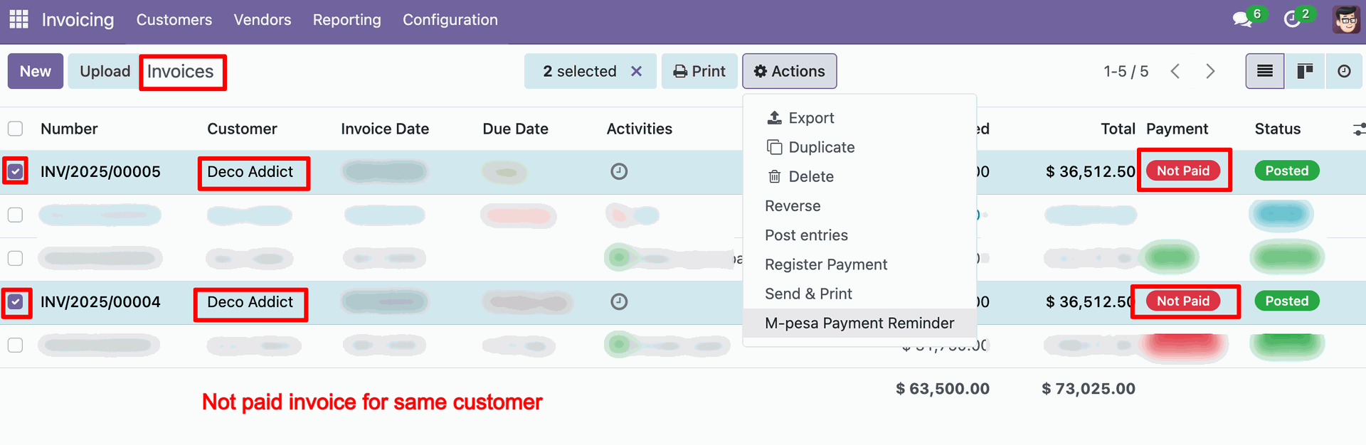 In the invoice list view, select the invoices and click on the "M-Pesa Payment Reminder" from the Action.