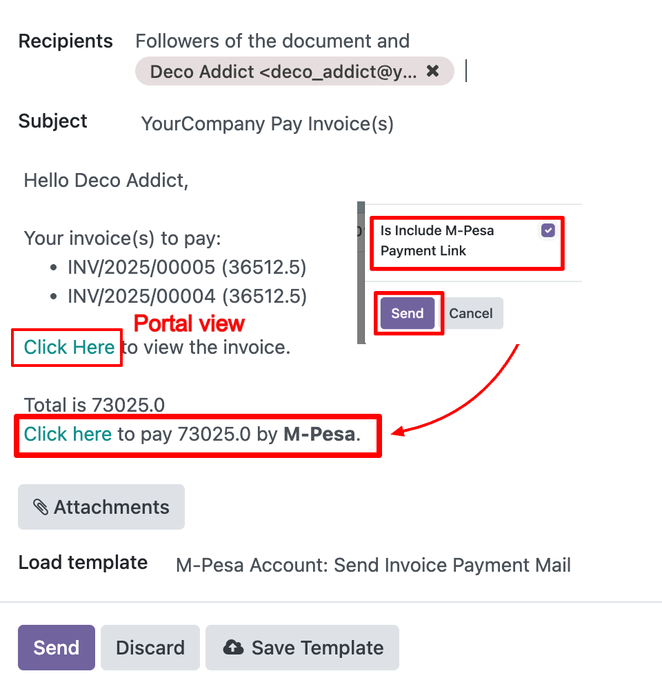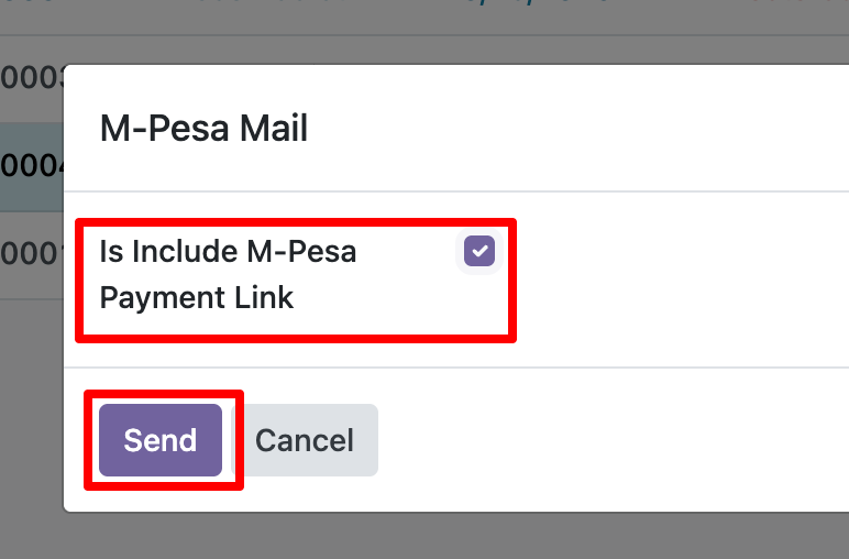 Enable the “Include M-Pesa Payment Link” boolean and click on the “Send” button.