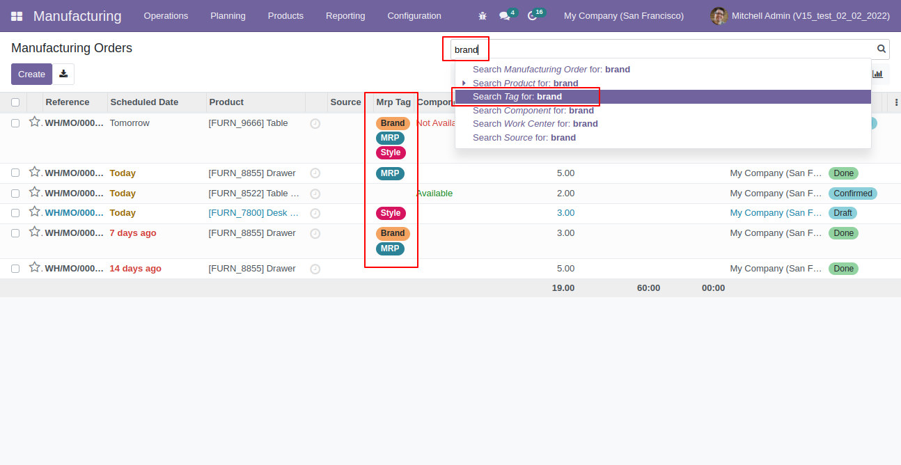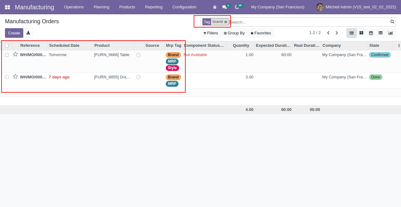 - You can find and filter manufacturing order records using tags.