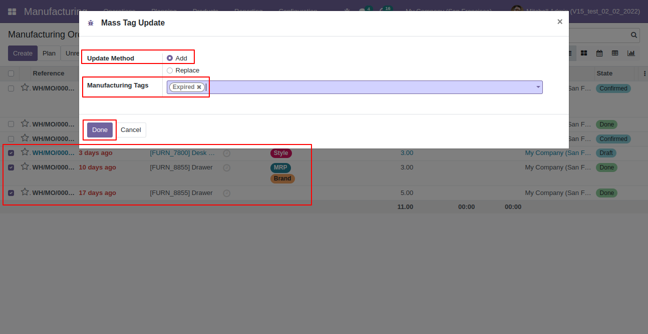 This module enables the feature to create a manufacturing tags. You can change the color of tags as per need. You can filter & search manufacturing records using particular tags. We provide feature to update mass MRP tags.