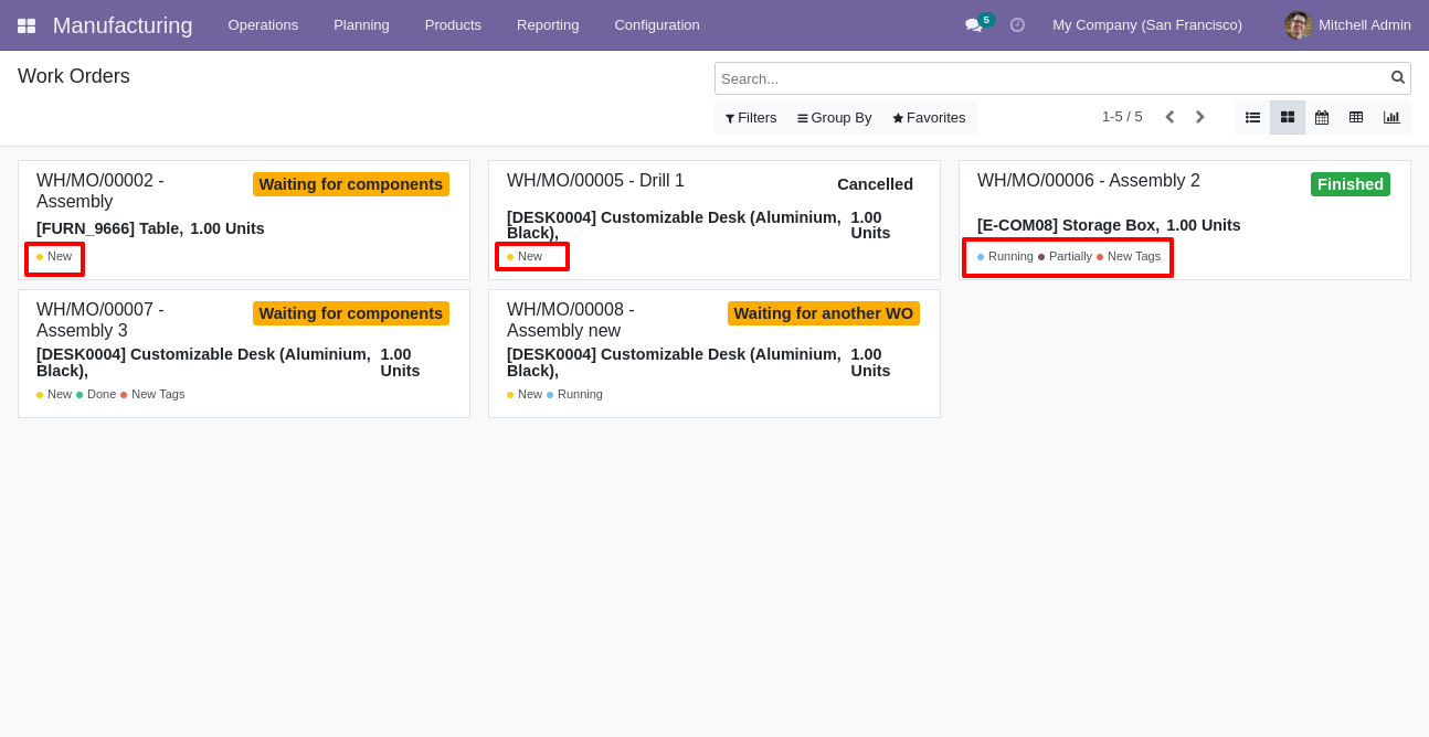 Work Center kanban view with tags.