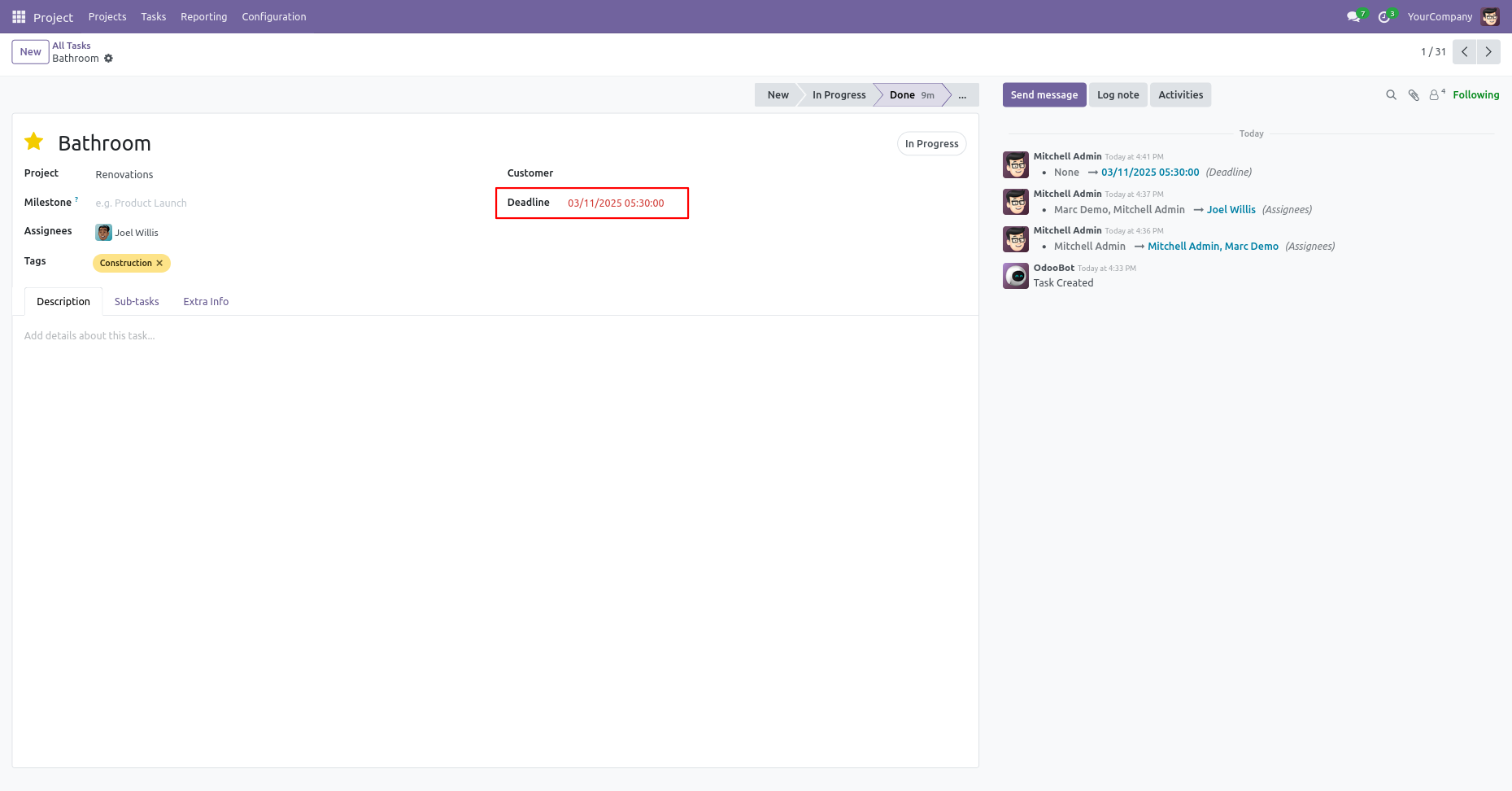 Sometimes, we need to update multiple tasks, and updating each task individually can be challenging. With this module, you can update multiple tasks by specifying their tags, deadlines, and assigned persons. Simply select the tasks from the list view and update them!