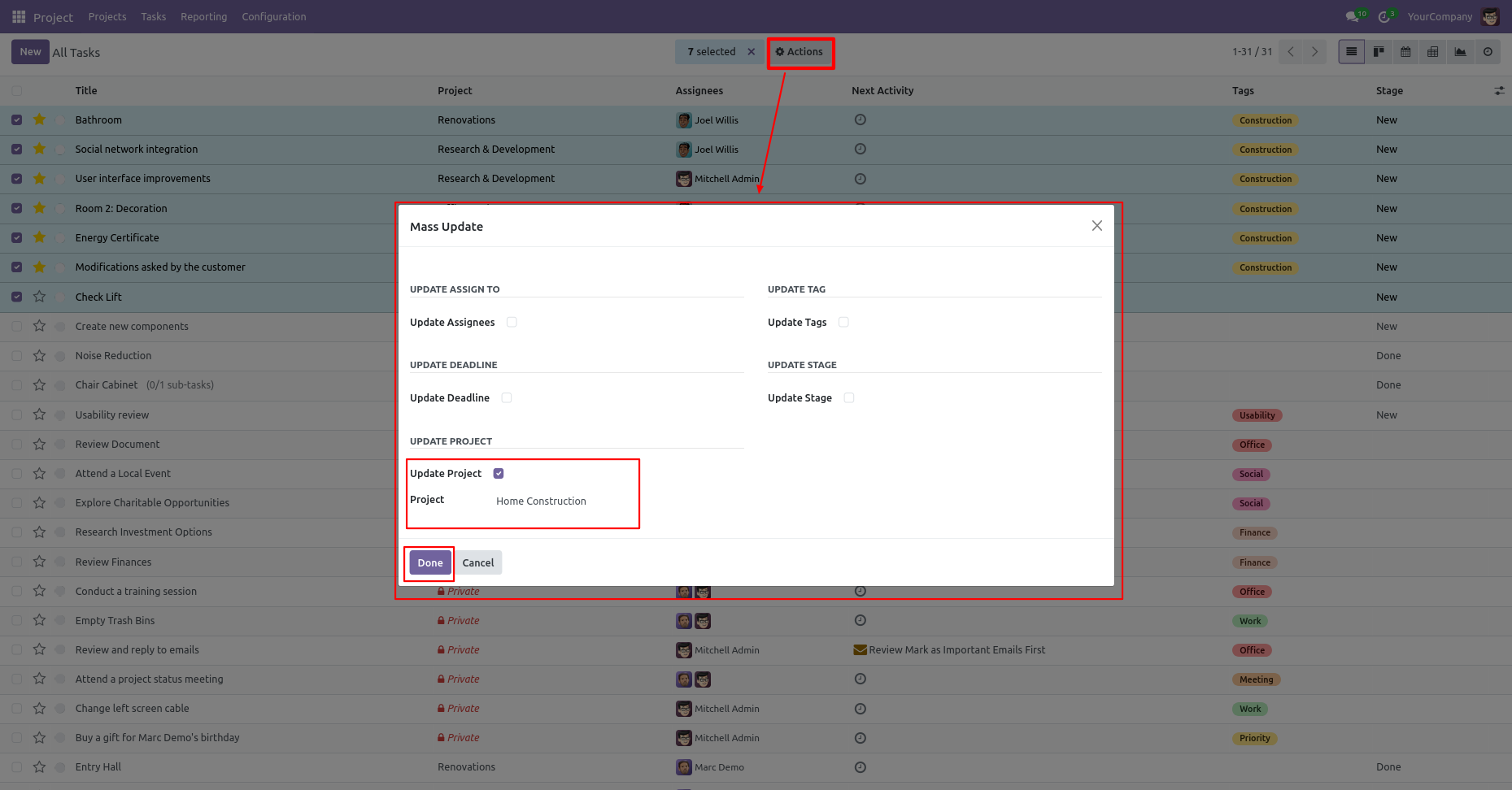 Select the tasks from the list view and then from the 'Action' menu select 'Mass Update' so it opens one wizard, here we update the stages of the mass tasks.