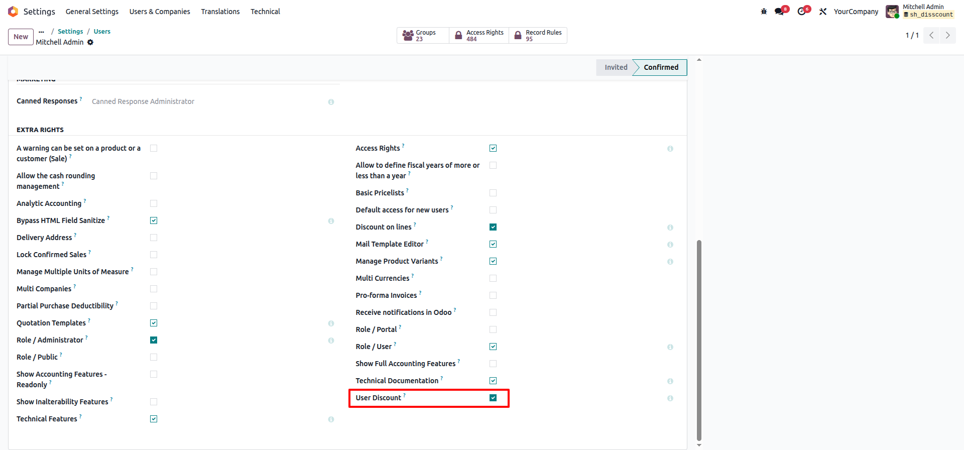 This module allows you to define minimum and maximum discount percentages per salesperson and requires a designated approver if limits are exceeded. When a salesperson applies a discount out of bounds on a quotation, it automatically changes to 'Waiting for Approval', logs an activity for the approver, and sends email notifications.