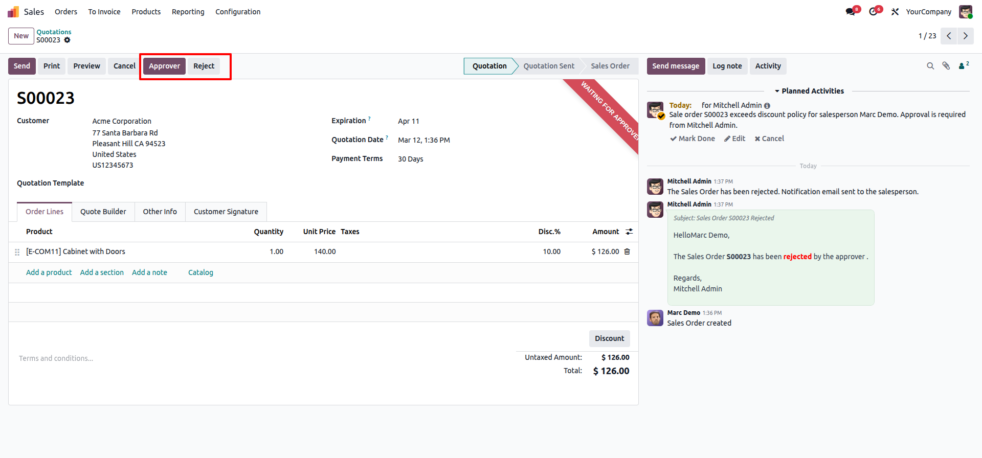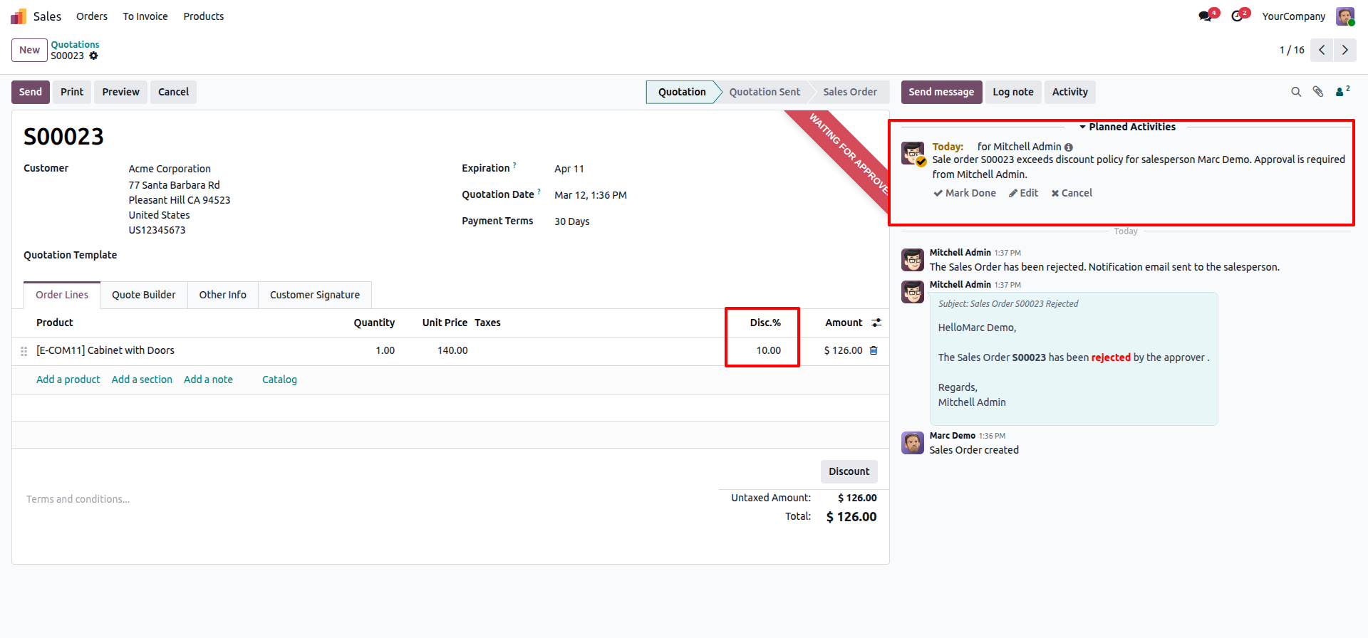 Quotation goes to 'Waiting for Approval' state and creates an activity if discount exceeds limits.