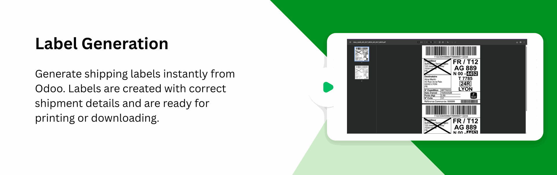 Generate multiple shipping labels in one action directly from Odoo, allowing you to process bulk delivery orders faster.