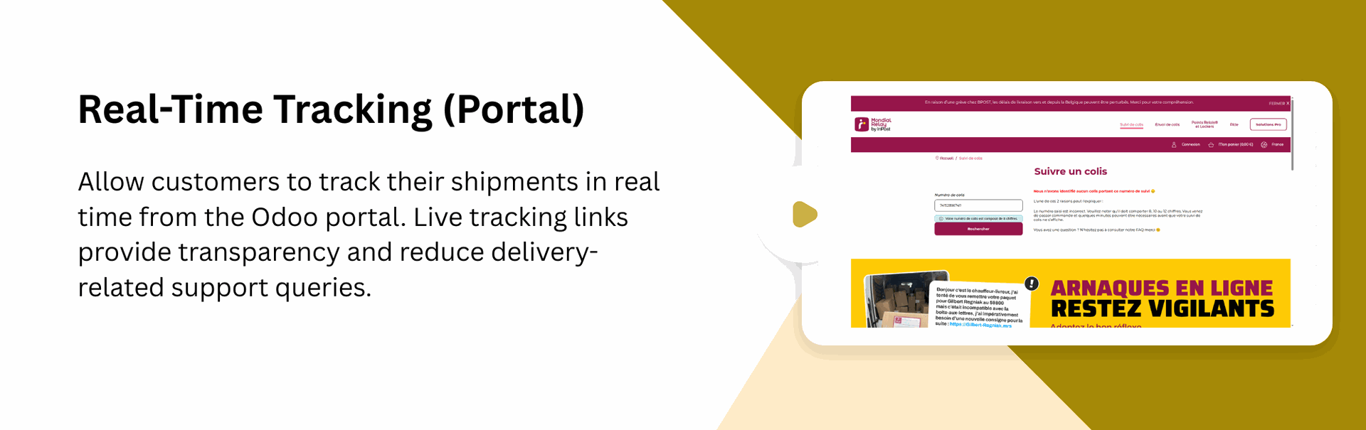 Track shipments in real-time within Odoo, admins can monitor deliveries from the backend, while customers can track from portal.