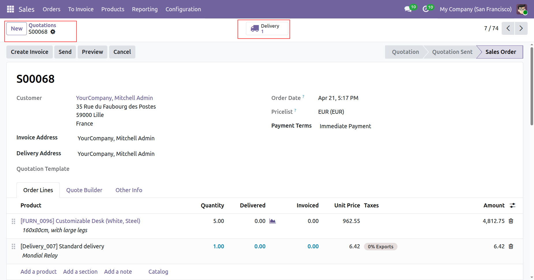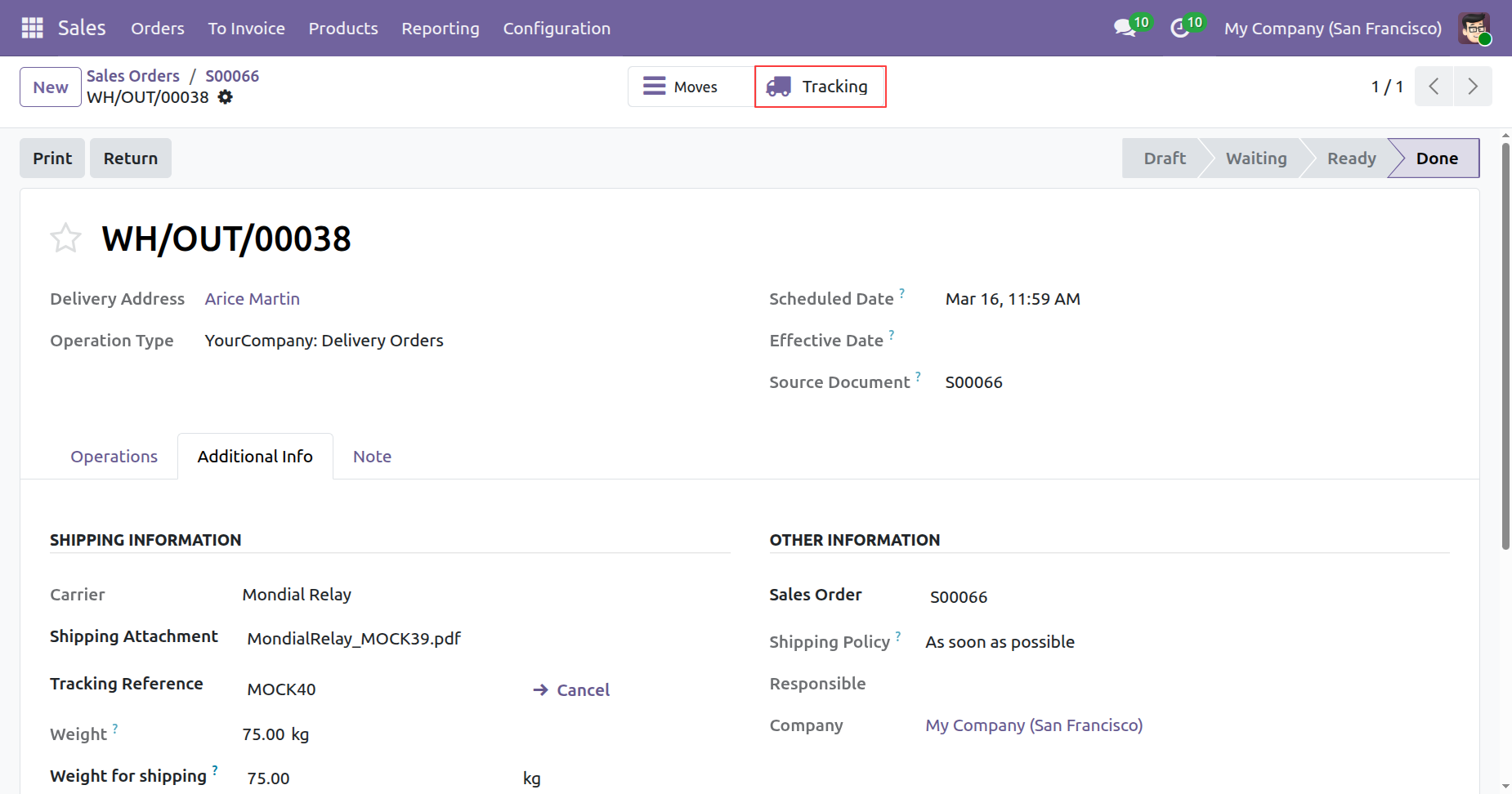 Once a delivery is validated, use the highlighted Tracking smart button to view real-time shipping updates and access carrier-generated labels directly from the order.