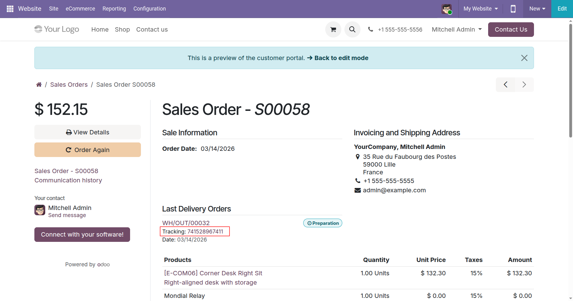Website order with tracking details.