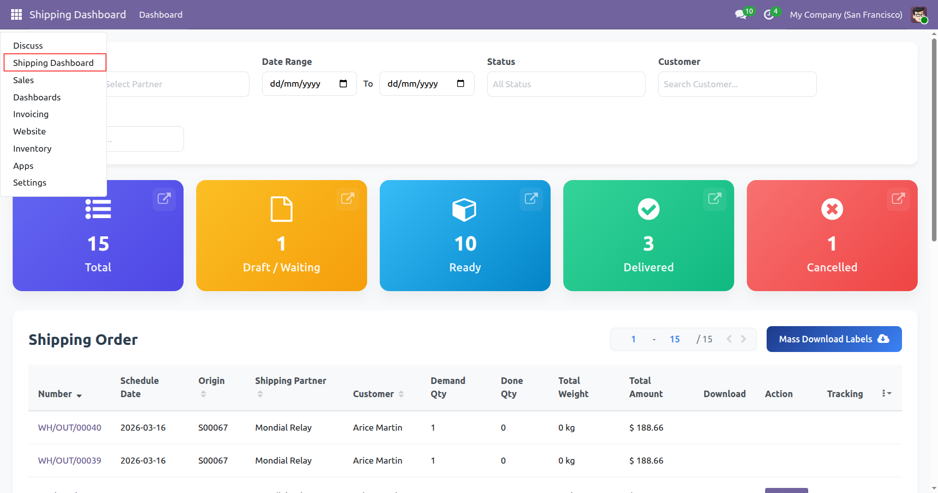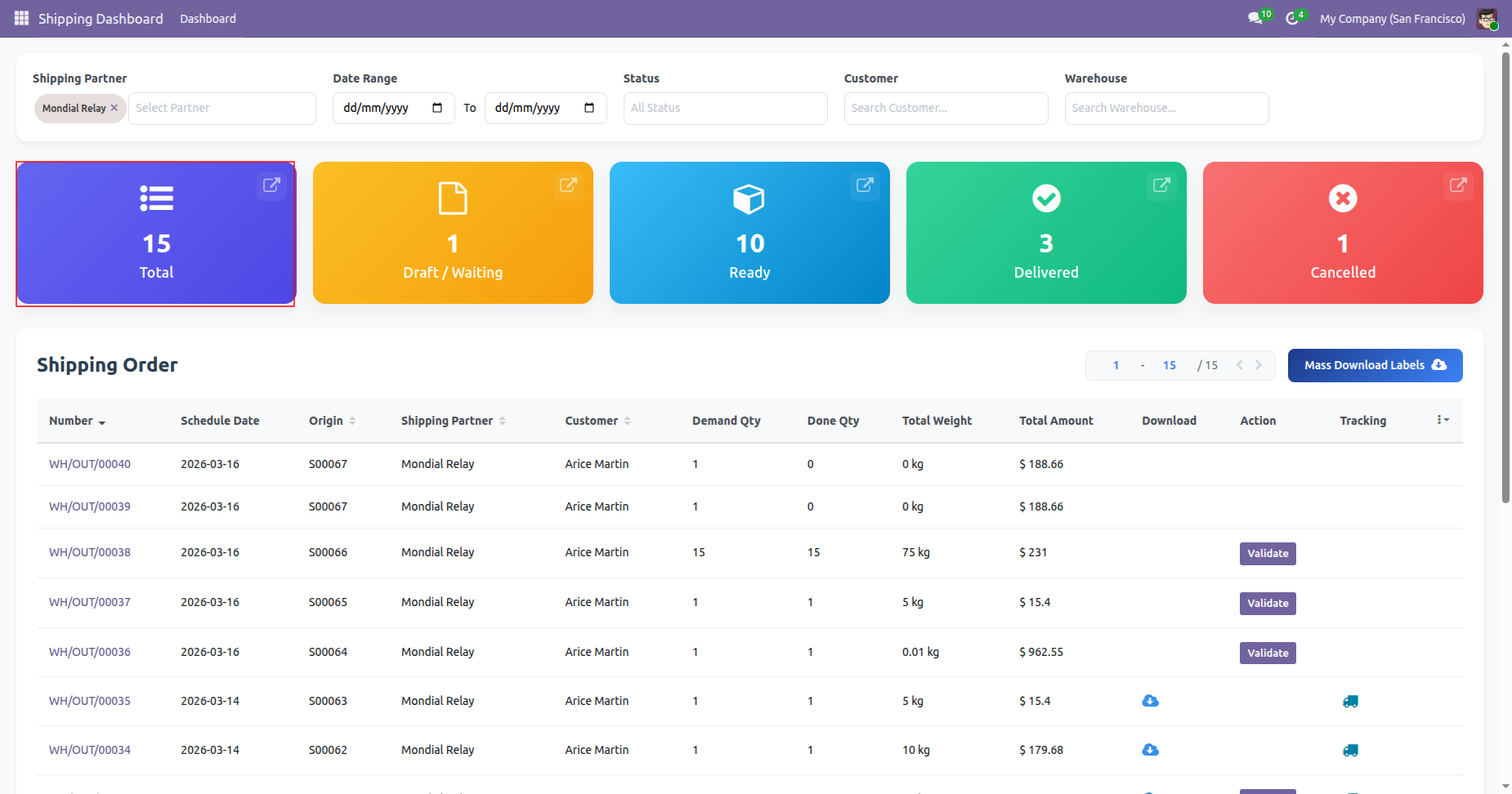Filter the Shipping Dashboard by a specific Shipping Partner, such as Mondial Relay. Click 'Mass Download Labels' to download all at single click, You can download and track shipping from the dashboard.