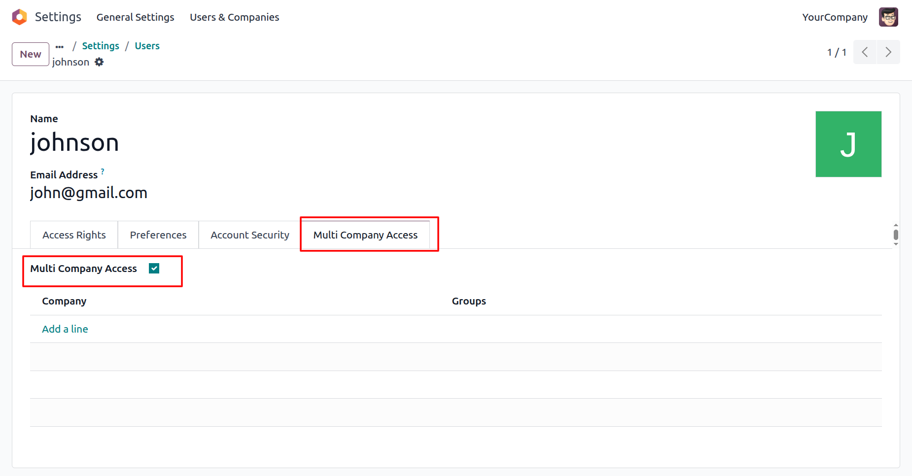 Assign different user groups (Sales, Invoicing, Inventory, etc.) separately for each company based on requirements.