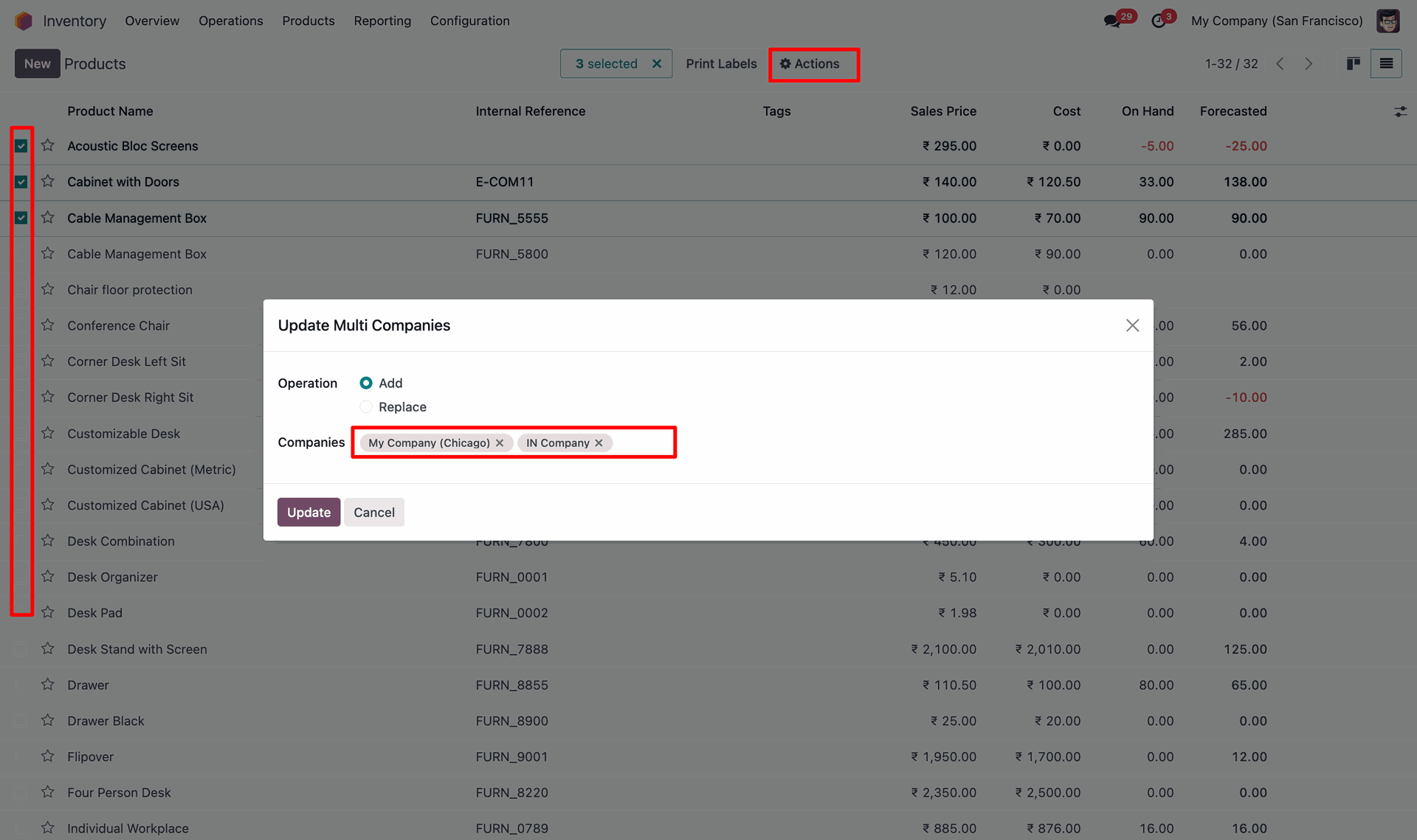 Shows the popup for Update Multi Companies where users can select companies to add or replace. Makes mass company assignment simple and time-saving for product management.