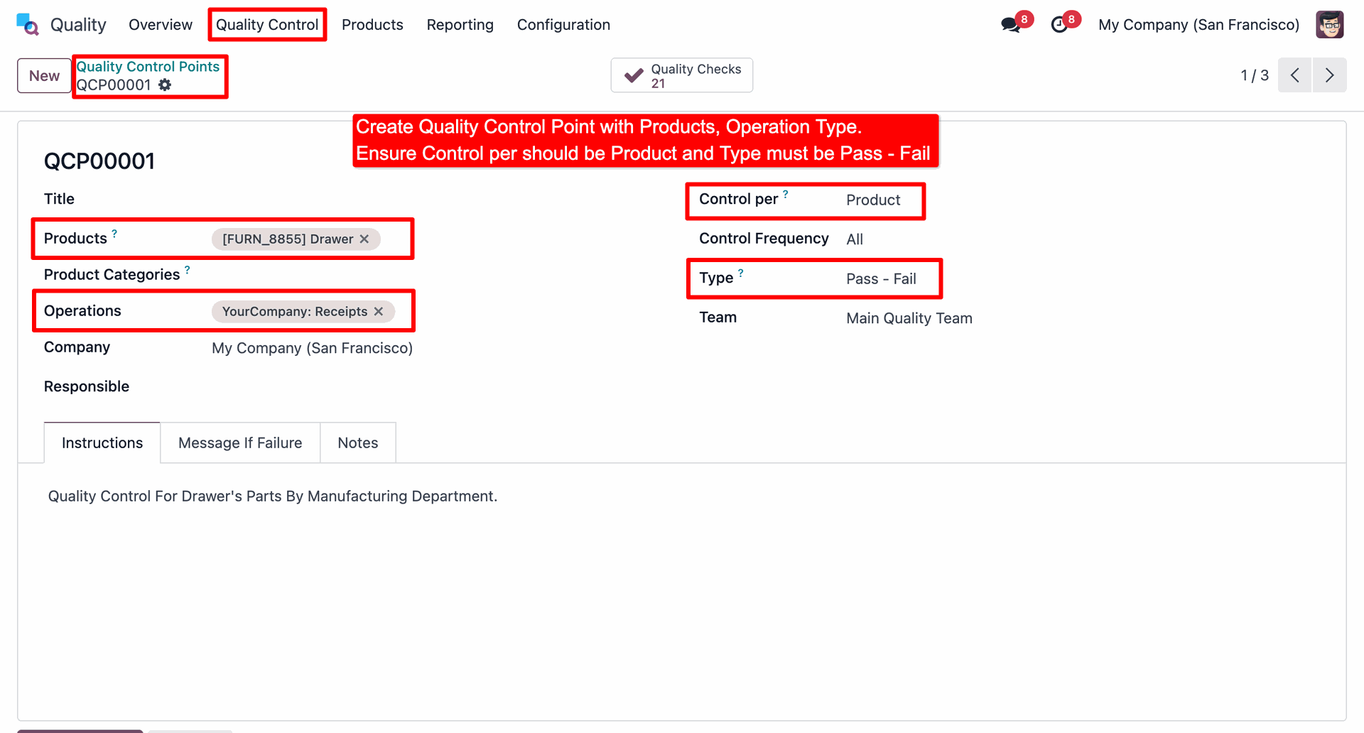 The user configures Quality Control Point QCP00001 for the Drawer product on Receipts, explicitly setting the Control per to Product and the Type to Pass - Fail.