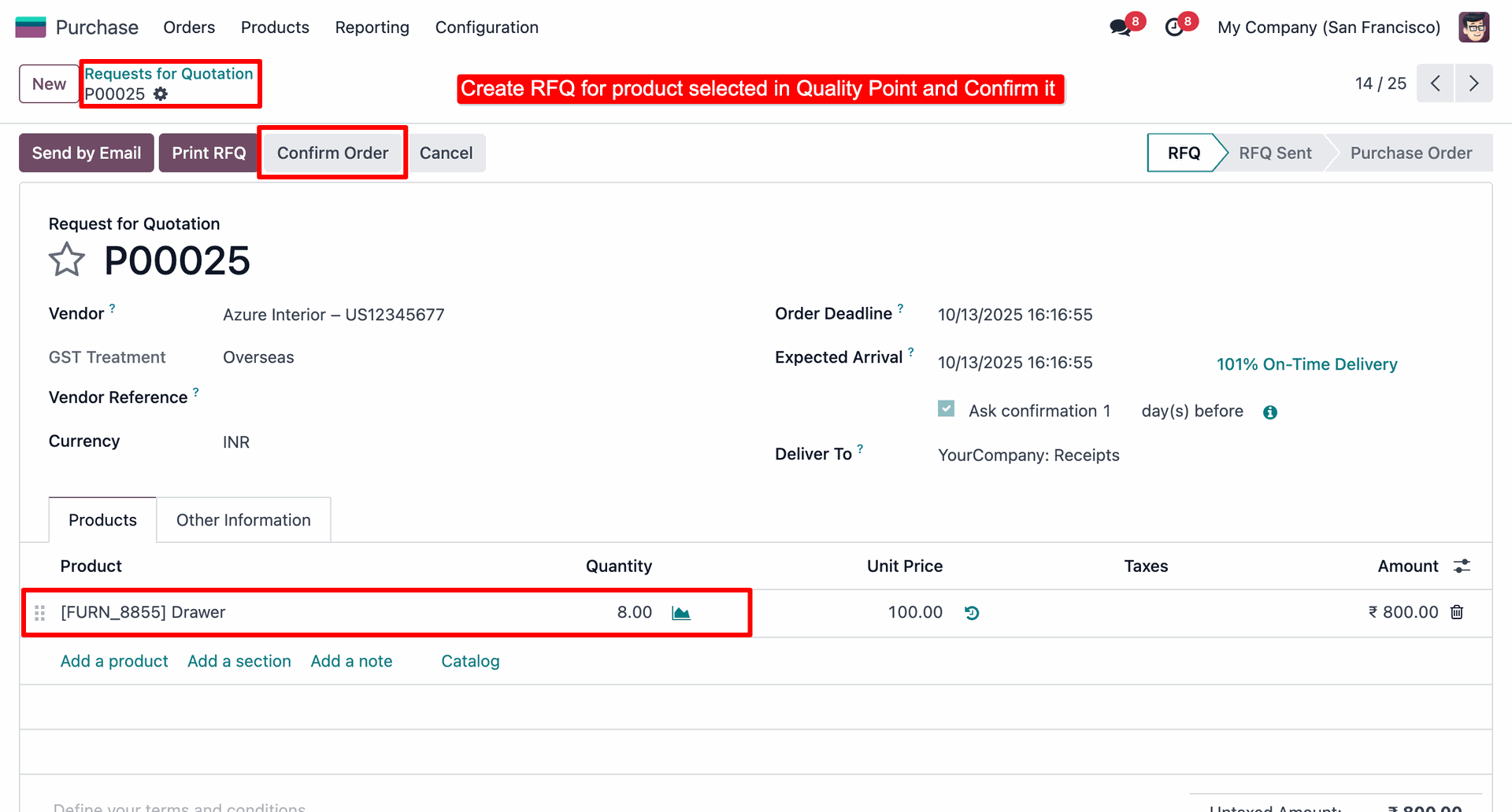 The user creates Request for Quotation P00025 for 8 units of the Drawer product and clicks Confirm Order to finalize the transaction.