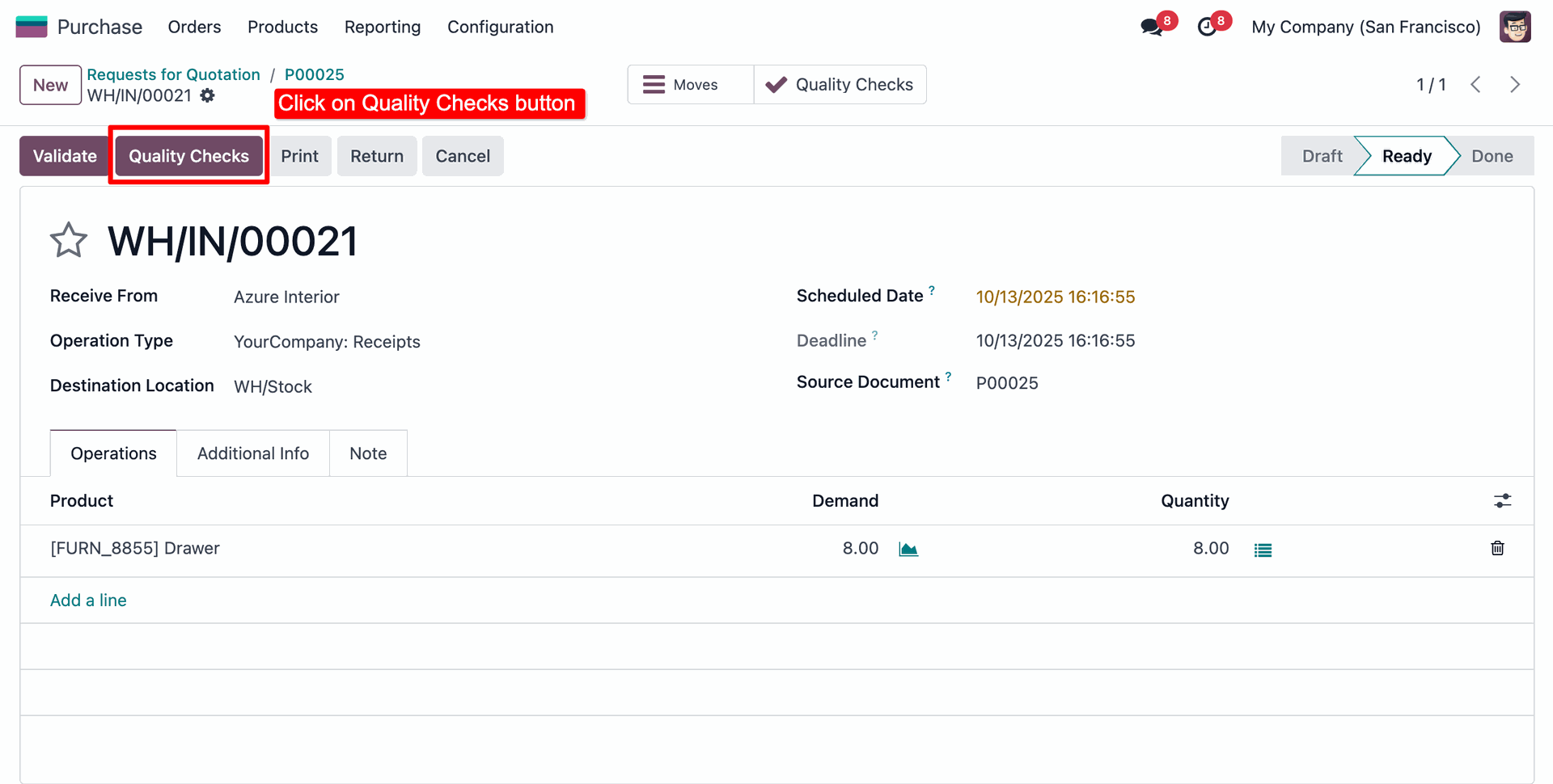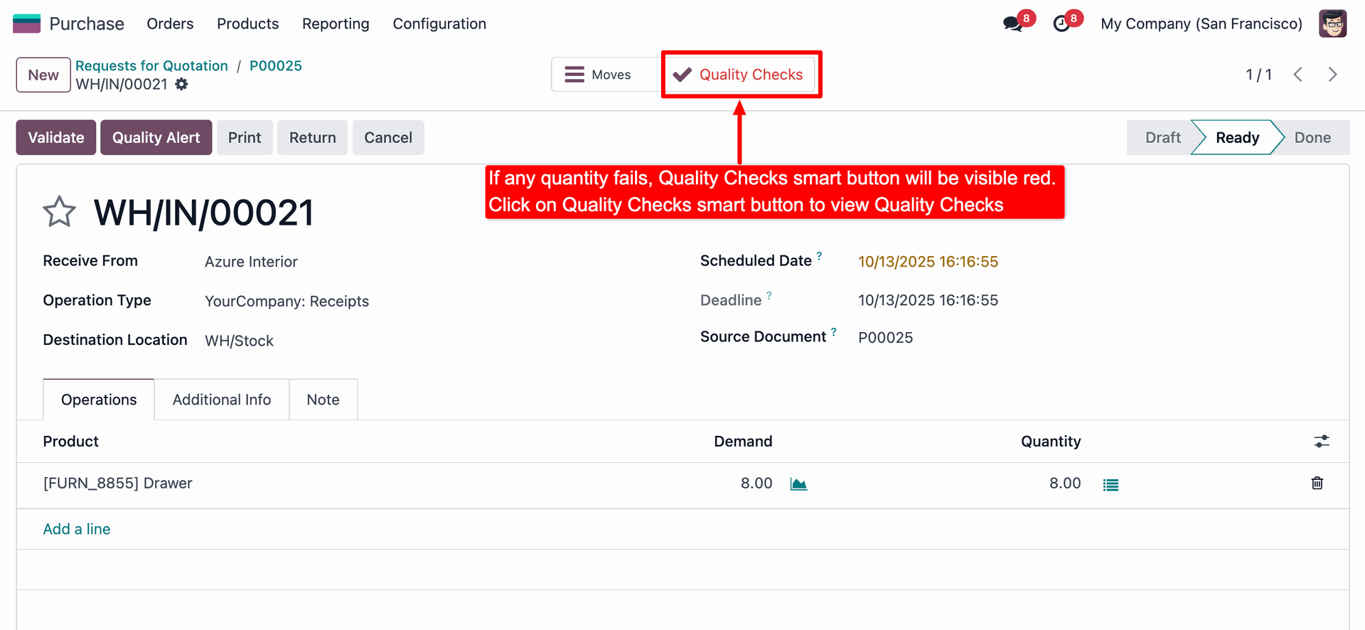 The user clicks the Quality Checks button on receipt WH/IN/00021, as highlighted by the red box, to start the inspection of the incoming Drawer units.