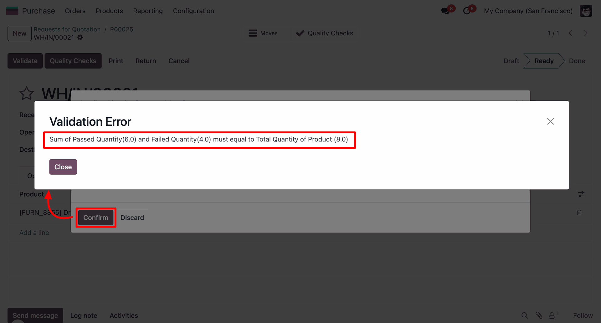 The system displays a Validation Error after the user clicks Confirm, alerting that the sum of passed (6.0) and failed (4.0) quantities does not match the total product quantity of 8.0.