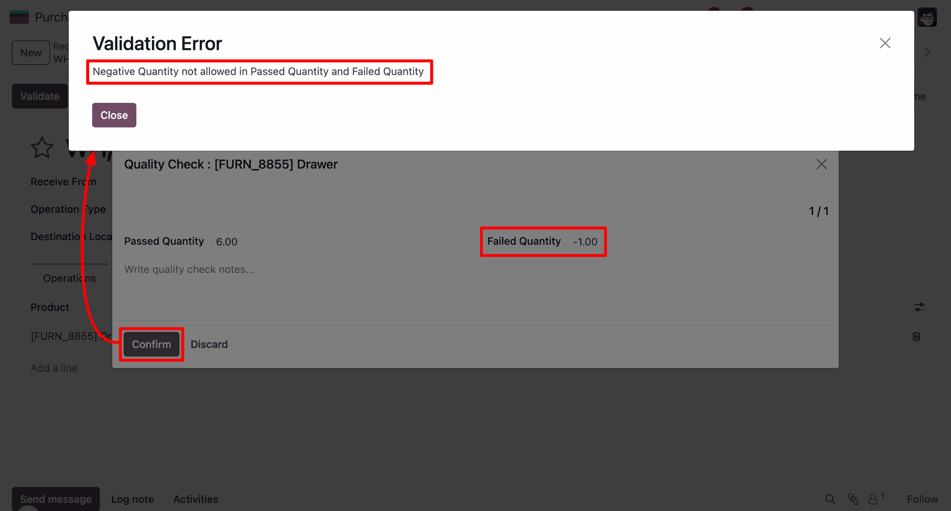 The system triggers a Validation Error when the user attempts to confirm the quality check with a Failed Quantity of -1.00, enforcing the rule that negative quantities are not allowed.